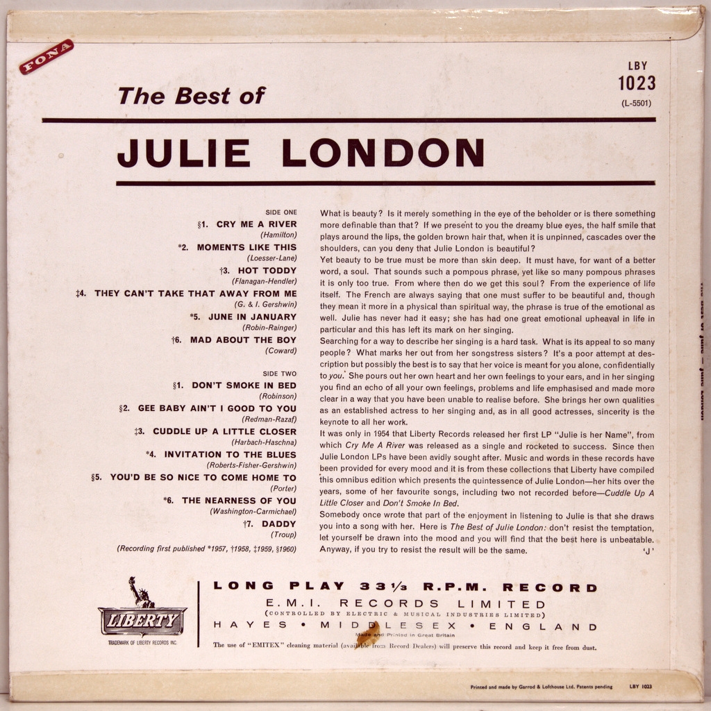 JULIE LONDON - BEST OF JULIE-1962-ПЕРВЫЙ ПРЕСС UK-LIBERTY-LBY1023. Очень редкий британский оригинал Julie London. Best of — первая компеляция американской певицы Джули Лондон, выпущенный в 1962 году на лейбле Liberty Records. Примечательно , что она сама учавствовала в подборе треков для альбома.