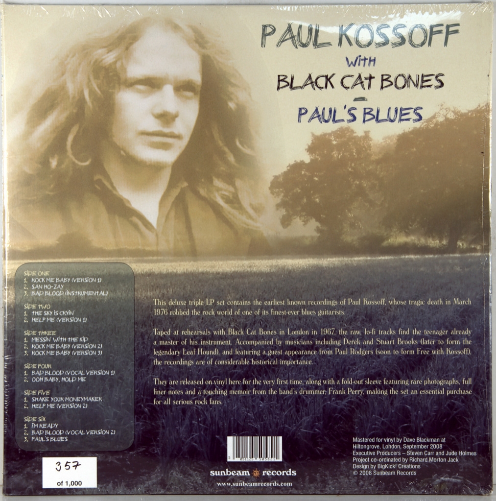 PAUL KOSSOFF WITH BLACK CAT BONES- PAUL'S BLUES (3LP'S) -1968-ПЕРВЫЙ ПРЕСС 2008 UK-SUNBEAM-SBR3LP5058. Очень редкий лимитированный оригинал 357 из 1000. Первая настоящая группа Коссоффа была группа, The Black Cat Bones. Она была блюз-рок-группой конца 60-х, в которой также участвовал будущий Свободный барабанщик Саймон Кирк (в то время как этот альбом также включает в себя таких, как Дерек и Стюарт Брукс из Leaf Hound, вместе с Полом Роджерсом). The Bones были хорошо известны на концертных площадках и выступали в качестве хаус-группы для многих приезжающих в США коллективов, а также поддерживали Fleetwood Mac и Питера Грина. В этом наборе из 3-х пластинок представлены самые ранние из известных работ Коссоффа, в том числе репетиции с группой The Bones в Лондоне в 1967 году. И содержание, и качество звука таковы, что только фанаты могут быть заинтересованы, но те же самые фанаты будут с удовольствием слушать пламенные джемы Коссоффа, когда он был на пике своей карьеры.