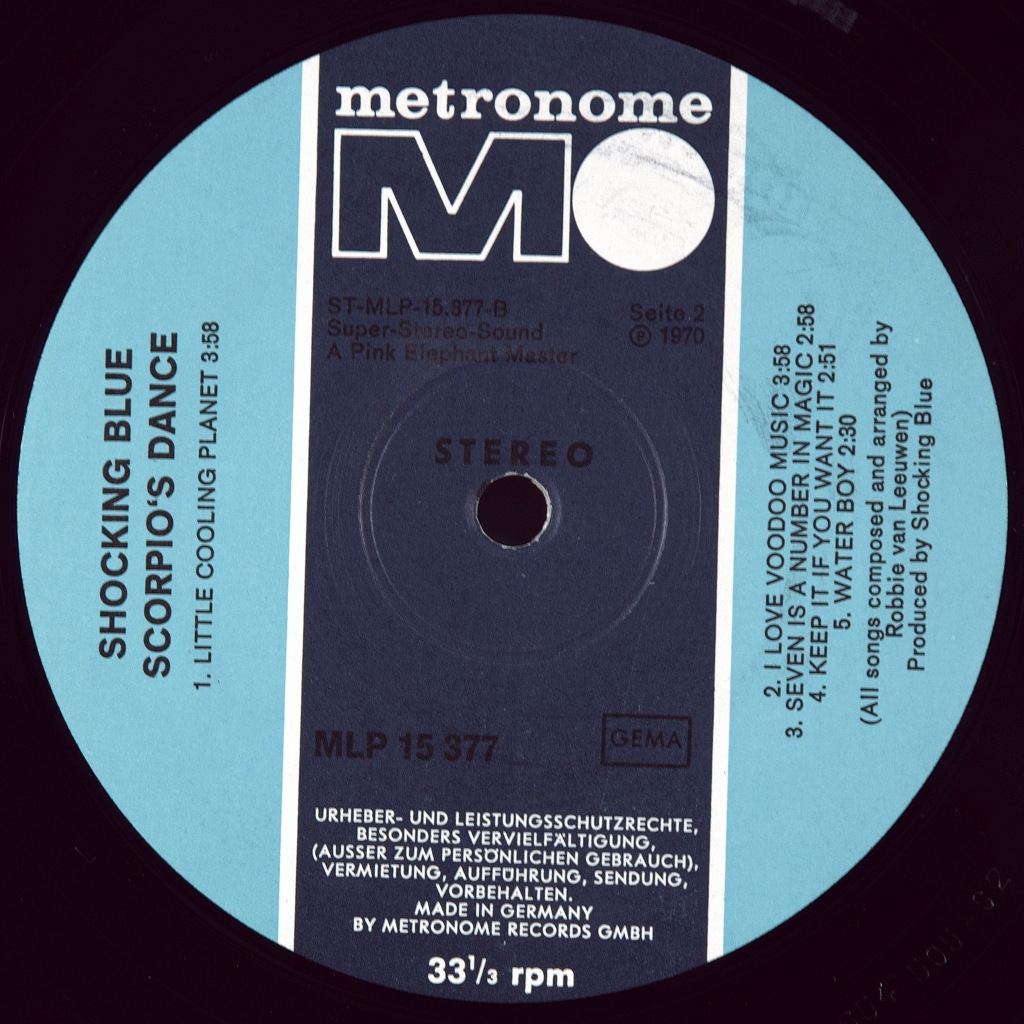 SHOCKING BLUE-SCORPIO'S DANCE-1970-ПЕРВЫЙ ПРЕСС GERMANY-METRONOME-MLP 15.377. Очень редкий германский оригинал культового альбома. Scorpio’s Dance — третий студийный альбом голландской рок-группы Shocking Blue, выпущенный в 1970 году на лейбле Pink Elephant. В этом альбоме группа решила поэкспериментировать с кантри и американой (в треках «Alaska Country» и «Sally Was a Good Old Girl»), сохраняя при этом свою ро́ковую направленность. Несмотря на растущую популярность группы, пластинка не пользовалась популярностью в США