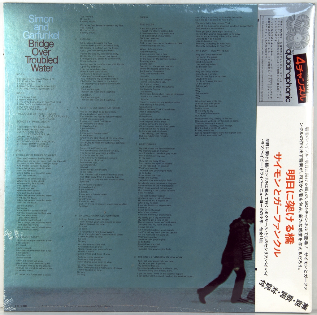 SIMON AND GARFUNKEL-BRIDGE OVER TROUBLED WATER-1970-ПЕРВЫЙ ПРЕСС QUADROPHONIC JAPAN-CBS-SOPN-17. Редкий японский оригинал культового альбома.Bridge over Troubled Water - пятый и последний студийный альбом фолк-рокового дуэта Simon and Garfunkel, выпущенный в январе 1970 года на Columbia Records. Bridge состоит из двух наиболее критически и коммерчески успешных песен дуэта, «Bridge over Troubled Water» и «The Boxer», которая был включена в список Rolling Stone, 500 величайших песен всех времён. Критически и коммерчески успешный, альбом возглавил чарты в более чем десяти странах и получил две премии «Грэмми», плюс ещё четыре за заглавную песню. Было продано около 25 миллионов записей, а также альбом попадал в различные списки, включая 51 место в 500 величайших альбомов всех времён по версии журнала Rolling Stone.