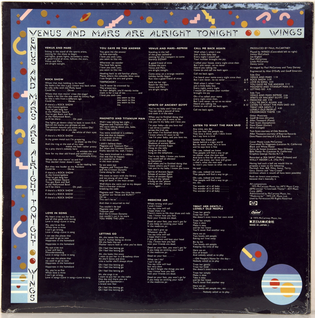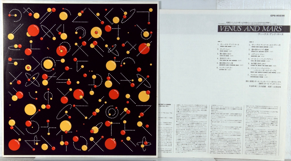 WINGS-VENUS AND MARS-1975-ПЕРВЫЙ ПРЕСС JAPAN-CAPITOL -EPS-80236. Редкий японский оригинал культового альбома. Venus and Mars - четвёртый студийный альбом группы Wings, вышедший в 1975 году. Диск был выпущен после необычайного успеха Band on the Run и также стал очень популярным. Первый альбом Пола Маккартни с лейблом Capitol Records. После выхода альбома Band on the Run в состав Wings в 1974 году вошли также Джимми Маккаллох (ведущий гитарист) и Джефф Бриттон (барабанщик). После того, как Маккартни написал несколько новых песен для будущего альбома, группа в январе 1975 года вылетела в Новый Орлеан, где была запланирована запись Venus and Mars.Бриттон, повздорив с Маккалохом, ушёл из состава группы, успев поучаствовать в записи только трёх песен альбома. Ему срочно подобрали замену — американца Джо Инглиша, с которым и была продолжена запись. Маккартни сделал песни в Venus and Mars плавно переходящими друг в друга, и альбом в этом смысле стал похож на альбом The Beatles Abbey Road. Альбом был принят очень тепло, и во всех странах континента он попадает в Топ-10 чартов. По итогам , альбом года, места тоже высоки, в Британии 5 место, США- 1 место по версии Billboard-200.