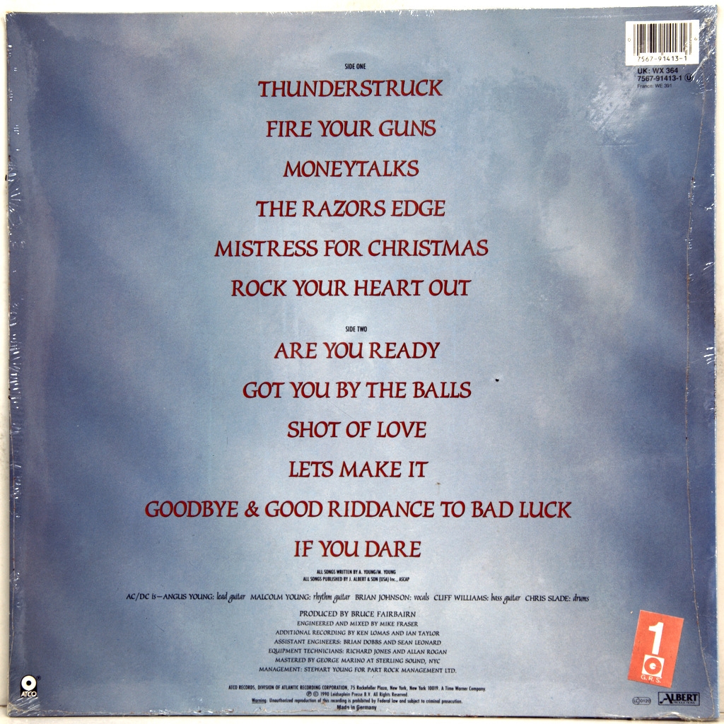 AC/DC-THE RAZORS EDGE-1990-ПЕРВЫЙ ПРЕСС UK/EU-GERMANY -ATCO-7567-91413-1/WX364. Альбом включает в себя песни «Thunderstruck» и «Moneytalks», одни из самых известных треков AC/DC. Огромный коммерческий успех вернул группе известность конца 70-х — начала 80-х годов. Альбом находится на 2 месте по рейтингу Billboard 200 в США и на 4 месте — в Великобритании. «The Razor’s Edge» был пятикратно сертифицирован как платиновый альбом (продано 5 миллионов копий), и в 2003 году, ремастированный, был включен в состав серии «AC/DC Remasters».