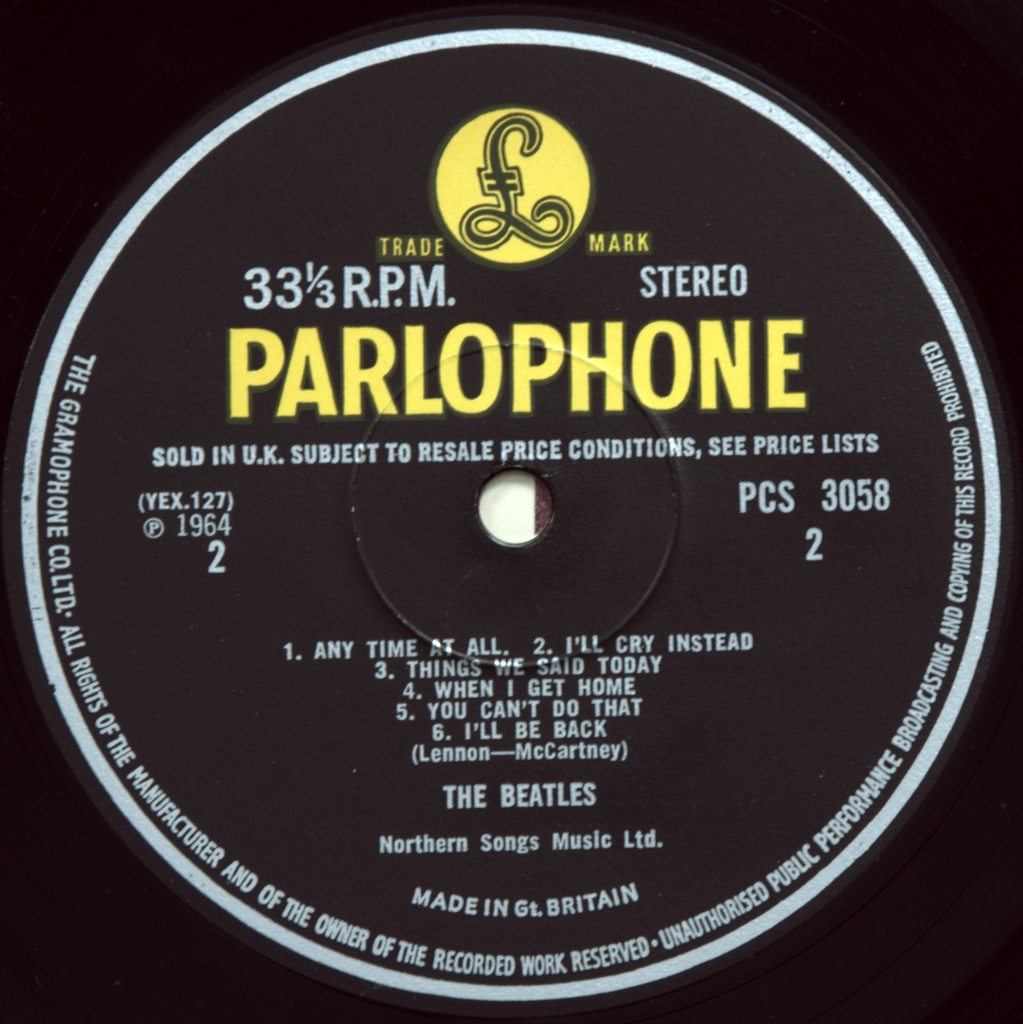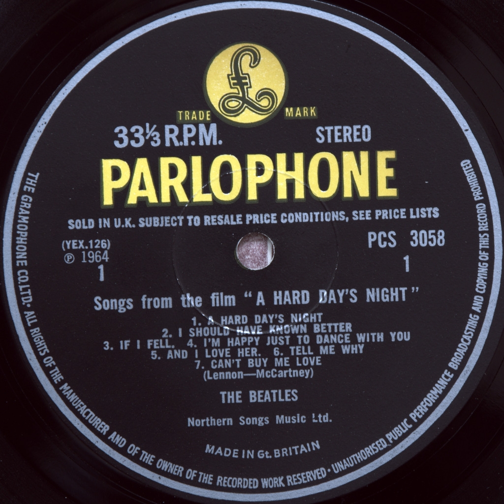 BEATLES-A HARD DAY'S NIGHT (STEREO)-1964-ОРИГИНАЛЬНЫЙ ПРЕСС 1965 UK-PARLOPHONE-PCS 3058. Матричные номера: Сторона 1: YEX 126-1; Сторона 2: YEX 127-1. стампера 3OL/2MD (ОЧЕНЬ РАНО!) Третий пресс с конца 1965 года. Черная этикетка с желтым логотипом и серебристым принтом. “ Грамопфон Со. ЛТД.” напечатано в начале периметру печати. "Запись впервые опубликована 1964" и "продано в Великобритании на тему..." С или без налогового кодекса КТ на этикетке.