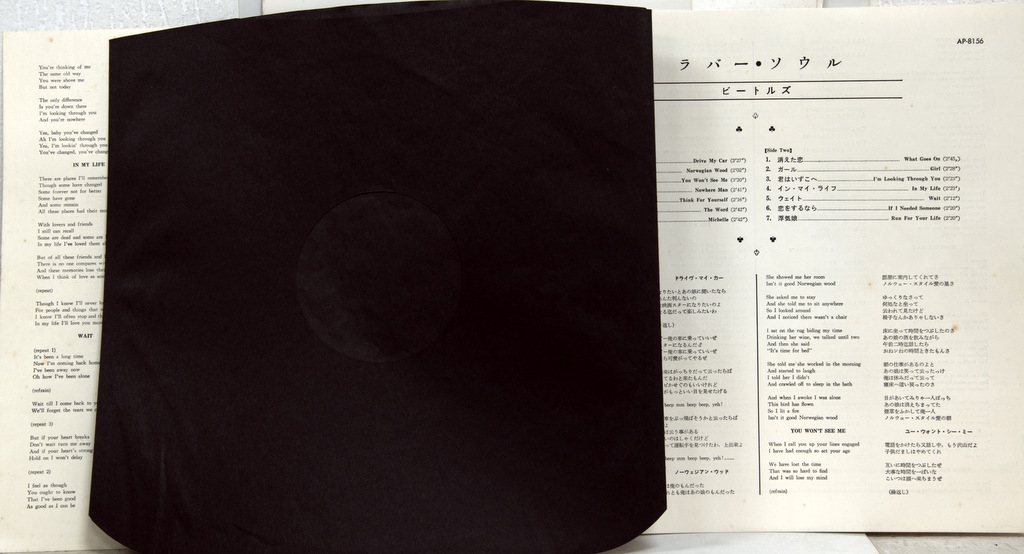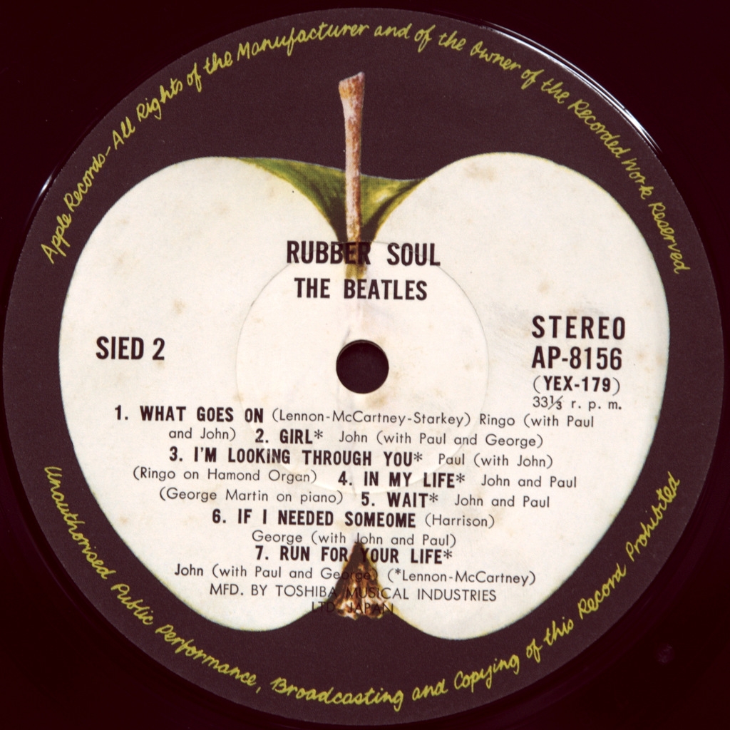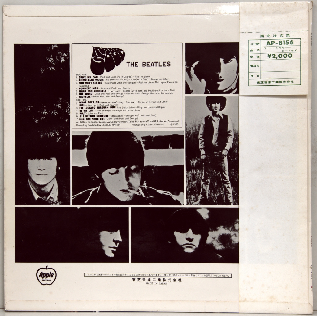 BEATLES-RUBBER SOUL (STEREO)-1965-ОРИГИНАЛЬНЫЙ ПРЕСС 1970 JAPAN-APPLE-AP8156. Очень редкое японское раннее издание в полной комплектации. Rubber Soul — шестой студийный альбом группы The Beatles, выпущенный 3 декабря 1965 года. Альбом был записан всего лишь за четыре недели, спешка была обусловлена желанием успеть выпустить альбом к рождественским праздникам. По мнению многих музыковедов, именно с альбома Rubber Soul в творчестве группы начались коренные изменения, которые привели к развитию множества необычных суб-течений в рок-музыке.
