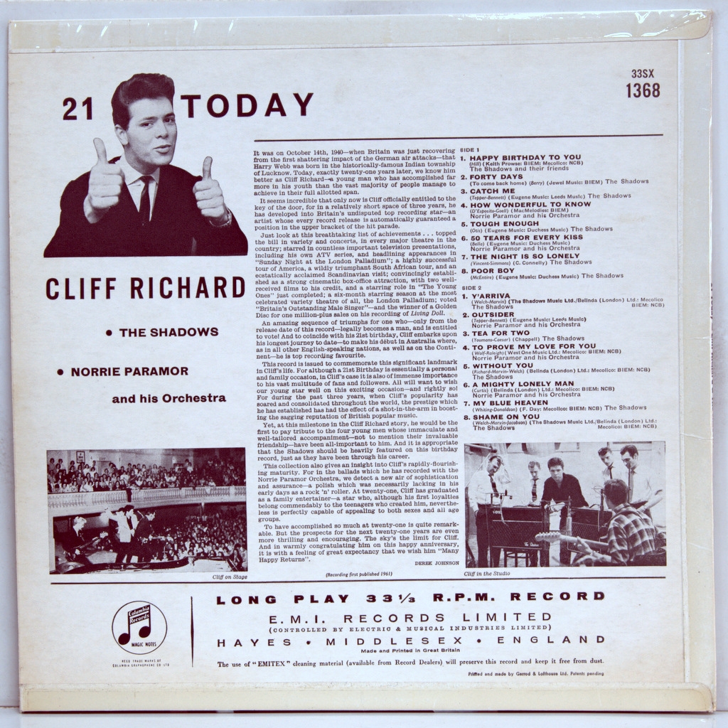 CLIFF RICHARD - 21 TODAY -1961-ПЕРВЫЙ ПРЕСС (MONO) UK-COLUMBIA-33SX1368. Редкий британский оригинал рок-бит группы. «21 Today» — четвёртый студийный альбом Клиффа Ричарда и его пятый альбом в целом. В каждом треке альбома звучит The Shadows. Он был выпущен на EMI Columbia Records 14 октября 1961 года, в день 21-летия Клиффа Ричарда, и стал его первым альбомом, занявшим первое место в британском чарте альбомов.