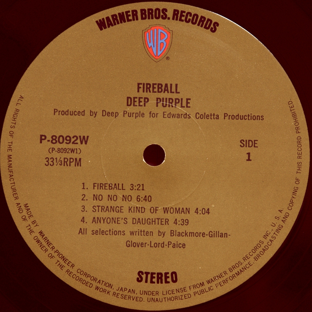 DEEP PURPLE-FIREBALL-1971-ВТОРОЙ ПРЕСС 1972 JAPAN-WARNER-P-8092W Редкое японское издание культового альбома. Fireball — пятый студийный альбом британской рок-группы Deep Purple. Записан в период с сентября 1970 до июня 1971 года, выпущен в сентябре 1971 года на лейбле Harvest Records. Альбом записывался в De Lane Lea Studios (как и его предшественник). По сравнению с Deep Purple in Rock, этот альбом был записан в более экспериментальном стиле. Allmusic назвал его одним из четырёх важнейших альбомов группы, наряду с Machine Head, In Rock и Burn. Йэн Гиллан, в отличие от остальных членов группы, считает данный альбом классикой Deep Purple. Тем не менее, он заметил, что включение в альбом «Anyone’s Daughter» (в стиле кантри и с шутливой лирикой) было весёлой, но ошибкой («A good bit of fun, but a mistake»). Джон Лорд выделял несколько треков альбома, такие как «No No No» и «Fools», и особенно отметил игру Пэйса в заглавной композиции. Трек «Strange Kind of Woman», выпущенный синглом в феврале 1971 года и поднявшийся до восьмого места в британских чартах. В первую неделю было продано 20 000 копий. Альбом высоко был оценен публикой и критиками, став мультизолотым по обе стороны атлантики.