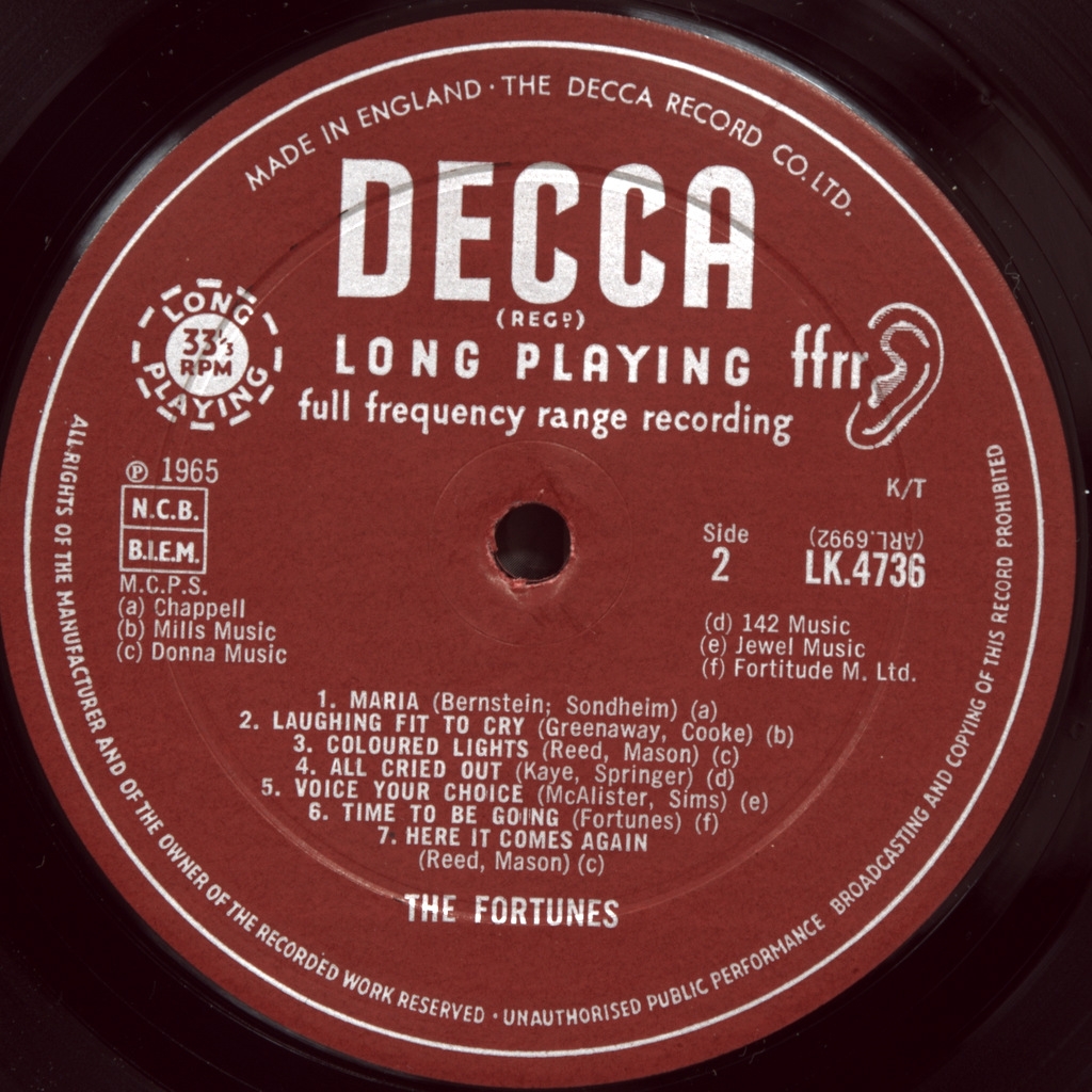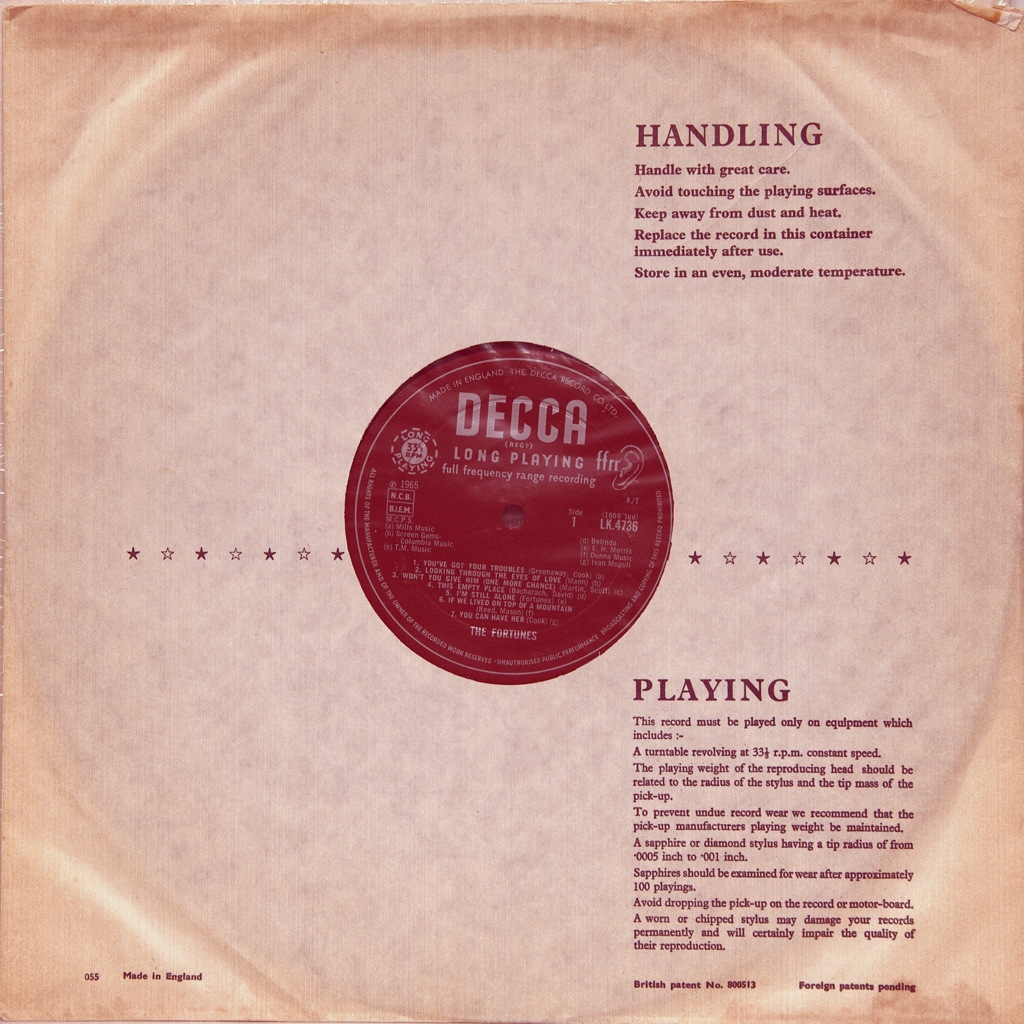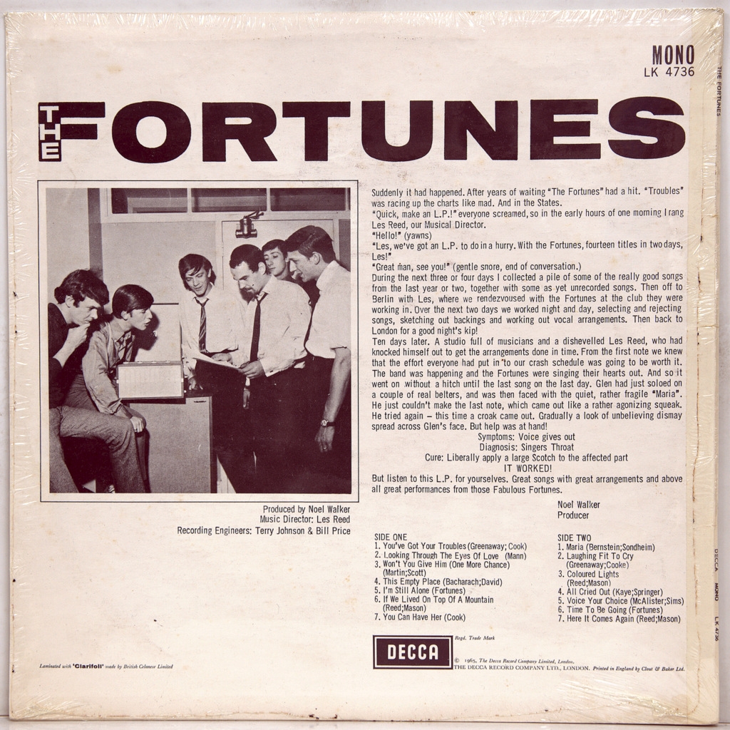 FORTUNES- SAME -1965-ПЕРВЫЙ ПРЕСС UK-DECCA-LK4736 Редкий оригинал культовой битовой группы. he Fortunes - английская хармони-бит-группа. Образованные в Бирмингеме, the Fortunes впервые получили известность и международное признание в 1965 году, когда "You've Got Your Troubles" ворвались в Топ-10 США, Канады и Великобритании. Впоследствии у них была череда хитов, в том числе «Here It Comes Again» и «Here Comes That Rainy Day Feeling Again», а в 1970-х годах они выпустили ещё больше успешных во всём мире песен, таких как «Storm in a Teacup» и «Freedom Come, Freedom Go». В 1966 году их менеджер Реджинальд Калверт был застрелен в споре о пиратских радиостанциях.