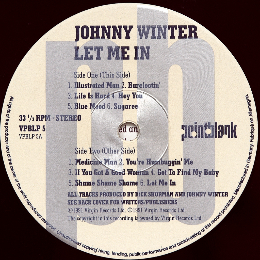 JOHNNY WINTER - LET ME IN- 1991-ПЕРВЫЙ ПРЕСС UK/EU GERMANY -VIRGIN-PVBLP5. Редкий европейский оригинал одного из отцов блюза. Let Me In — альбом гитариста и певца Джонни Уинтера. Он был выпущен в 1991 году на виниле и компакт-диске лейблом Pointblank Records. «Впусти меня» был номинирован на премию «Грэмми» за лучший альбом в жанре современного блюза.