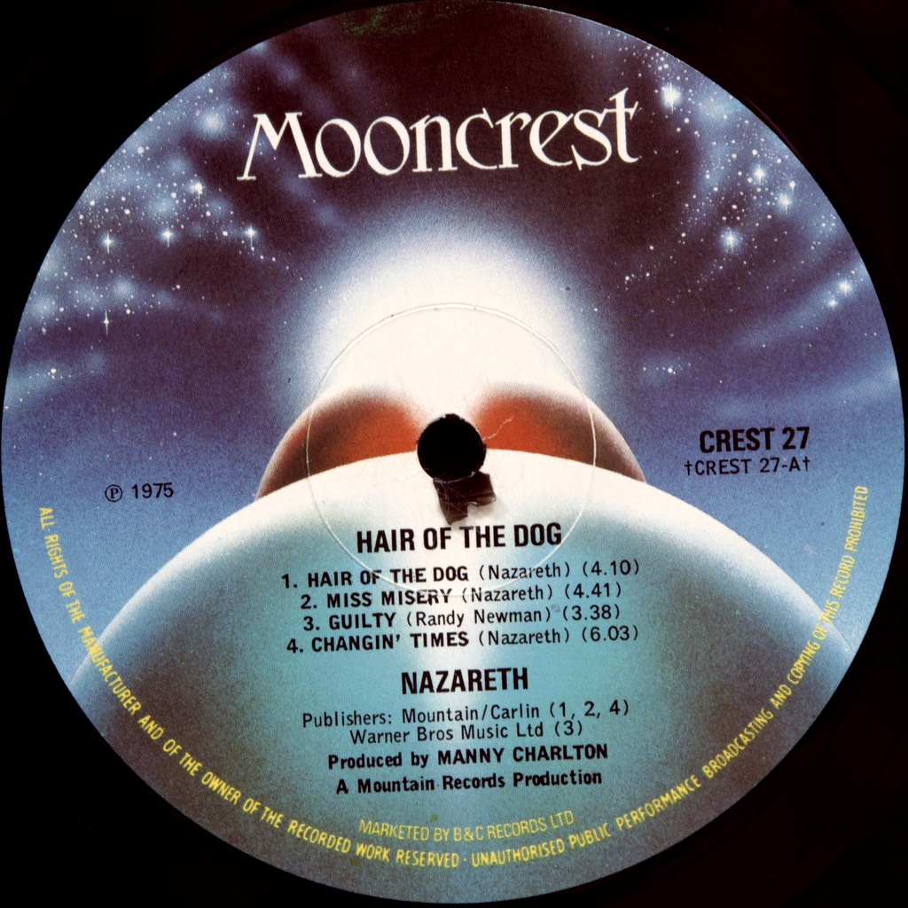 NAZARETH-HAIR OF THE DOG-1975-Первый пресс UK-MOONCREST-CREST 27. Матрицы A-2U/B-1U. Стампера 1RG/1GD (Очень рано!) .Hair of the Dog — шестой студийный альбом шотландской рок-группы Nazareth, вышедший в 1975 году. Выпущен в апреле 1975 года лейблом Mooncrest в Великобритании, A&M Records — в Северной Америке. Самый коммерчески успешный альбом группы, по всему миру продано более двух миллионов экземпляров. В 2002 году занял 51-ую позицию в рейтинге «100 лучших рок-альбомов всех времён» по версии журнала Classic Rock.