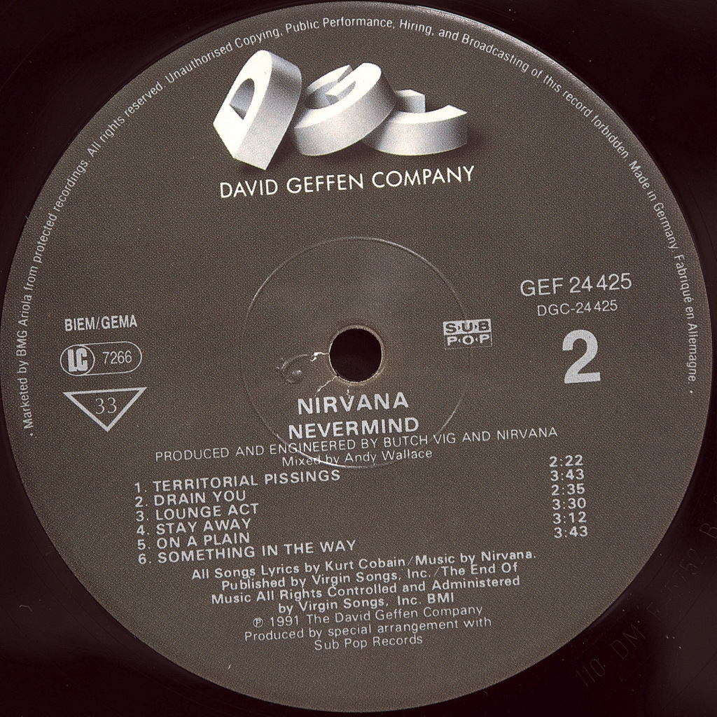 NIRVANA-NEVERMIND-1991-ПЕРВЫЙ ПРЕСС UK/EU-GERMANY-DGC- GEF24425 Очень редкий оригинал основателей гранжа.Nevermind — второй и самый коммерчески успешный альбом американской гранж-группы Nirvana. Был выпущен 24 сентября 1991 года на лейбле DGC Records, продюсером записи выступил Бутч Виг. В январе 1992 года альбом занял первое место в чарте журнала Billboard, опередив Майкла Джексона с диском Dangerous, что расценивается как знаковое событие для андеграундной музыки. Nevermind разошёлся тиражом более 30 миллионов копий по всему миру, американская ассоциация звукозаписывающих компаний сертифицировала его как «бриллиантовый». После выхода Nevermind альтернативный рок стал считаться частью мейнстрима[7], впоследствии критики признавали его одним из лучших альбомов всех времён, включая такие издания, как Rolling Stone, NME и Time