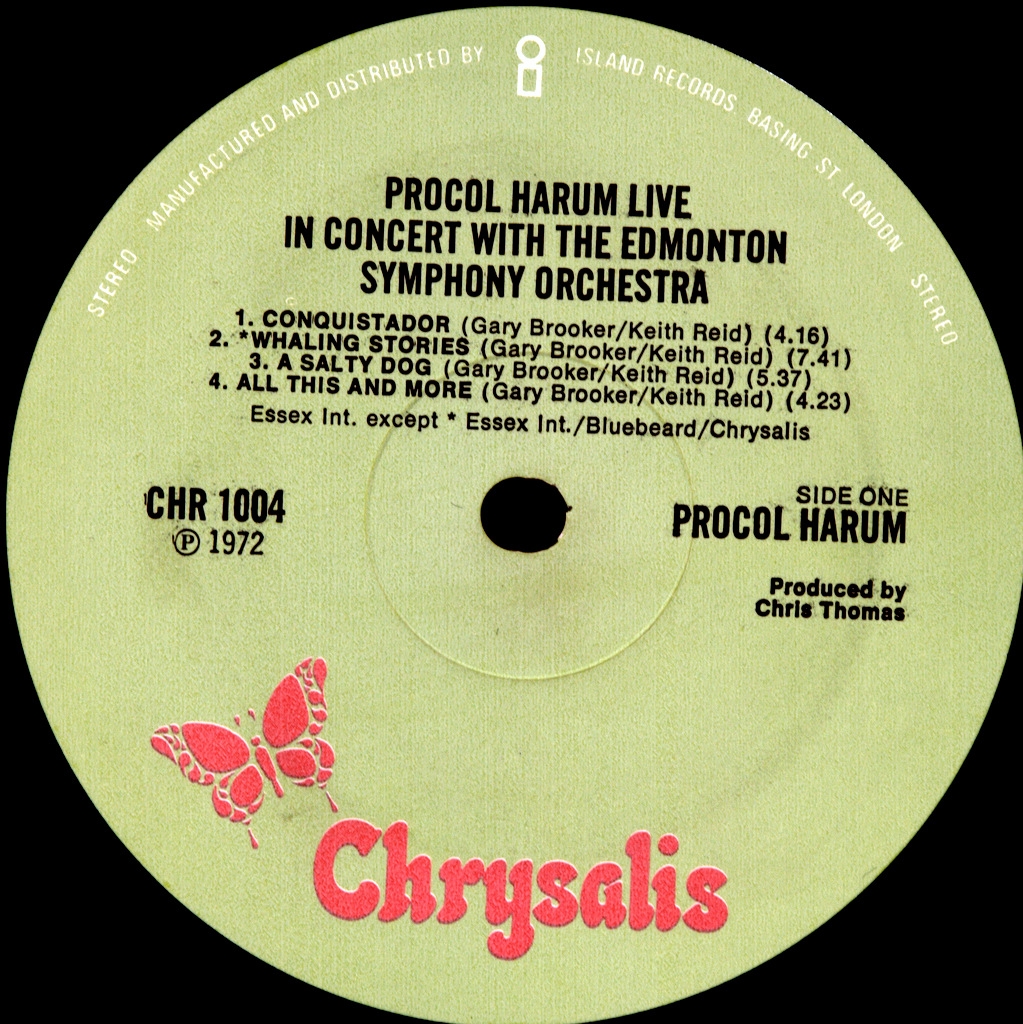 PROCOL HARUM-LIVE IN CONCERT WITH EDMONTON SYM. ORCH.-1972-ПЕРВЫЙ ПРЕСС UK-CHRYSALIS-CHR1004. Матрицы A-2U/B-2U Стампкра 2T/1T (Мечта!). Редкий британский оригинал. Концерт с Симфоническим оркестром Эдмонтона английской группы Procol Harum был выпущен в 1972 году; он был записан в Юбилейном зале Северной Альберты в Эдмонтоне, Альберта, Канада, 18 ноября 1971 года. Альбом достиг № 7 в Канаде и был очень успешным на Billboard топ-200, достигнув пика на 5. месте. Это самый продаваемый альбом группы, сертифицирован золотом RIAA. Живая версия песни «Conquistador» из этого альбома стала хитом как на поп-, так и на прогрессивном радио в США и вошла в топ-20 Billboard Hot 100, а также в топ-10 в нескольких других странах.