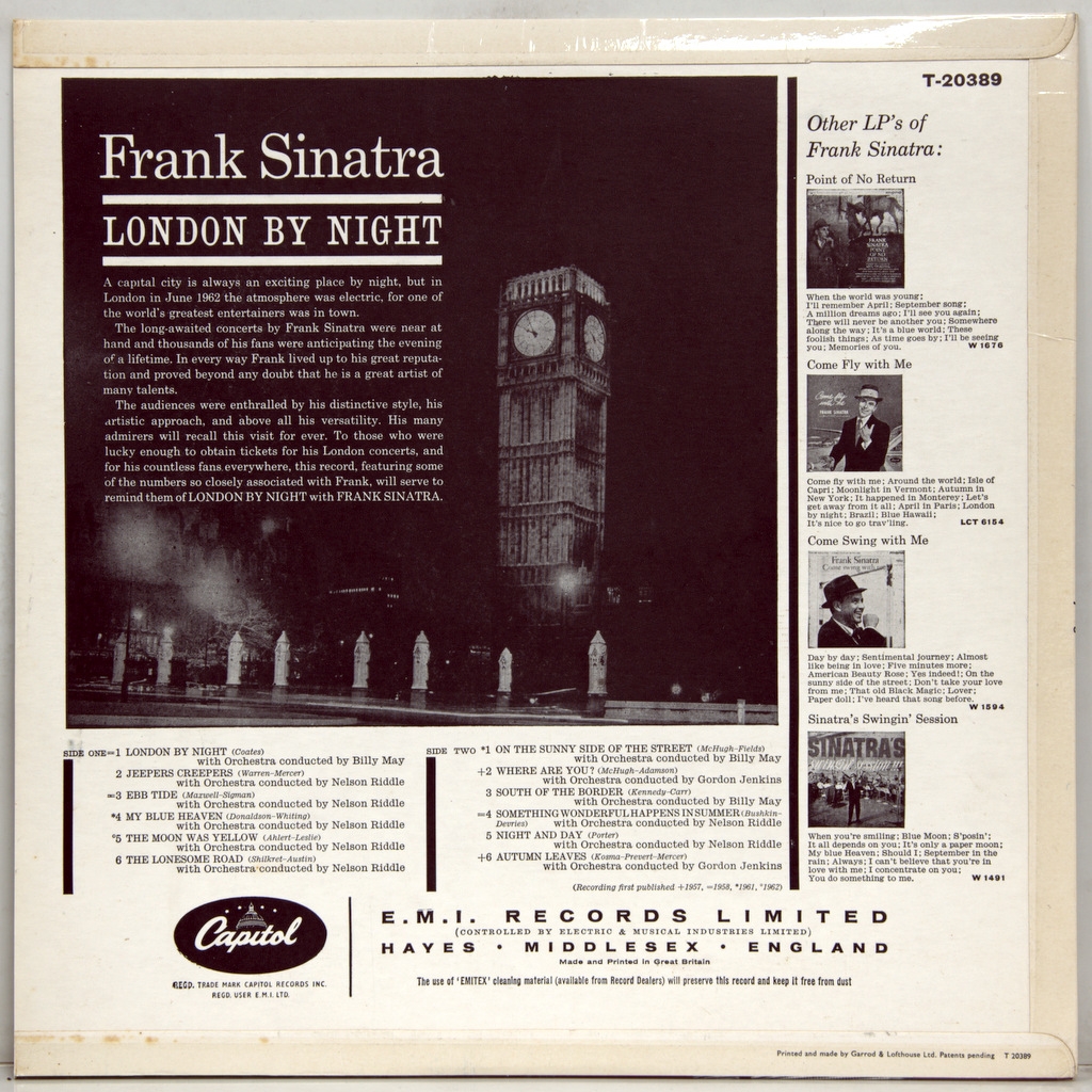 SINATRA, FRANK -LONDON BY NIGHT -1962-ВТОРОЙ ПРЕСС 1965 (MONO) UK-CAPITOL-T-20389. Редкий британский оригинал культового альбома. Альбом Фрэнка Синатры - это студийный альбом 1962 года вышедший у прилету Синатры в Британию. 30 мая 1962 года частный самолёт Фрэнка Синатры «Кристина» приземлился в лондонском аэропорту Хитроу. Это был первый раз, когда певец появился в столице Великобритании с 1953 года. 1 июня Синатра должен был выступить с благотворительным концертом в полночь в Королевском фестивальном зале в Лондоне перед аудиторией, в которую входили многие британские знаменитости и высокопоставленные лица, в том числе младшая сестра королевы Елизаветы II, принцесса Маргарет. Пресса подогревала ажиотаж, билеты быстро раскупались, и концерт Синатры стал самым ожидаемым событием года в городе.