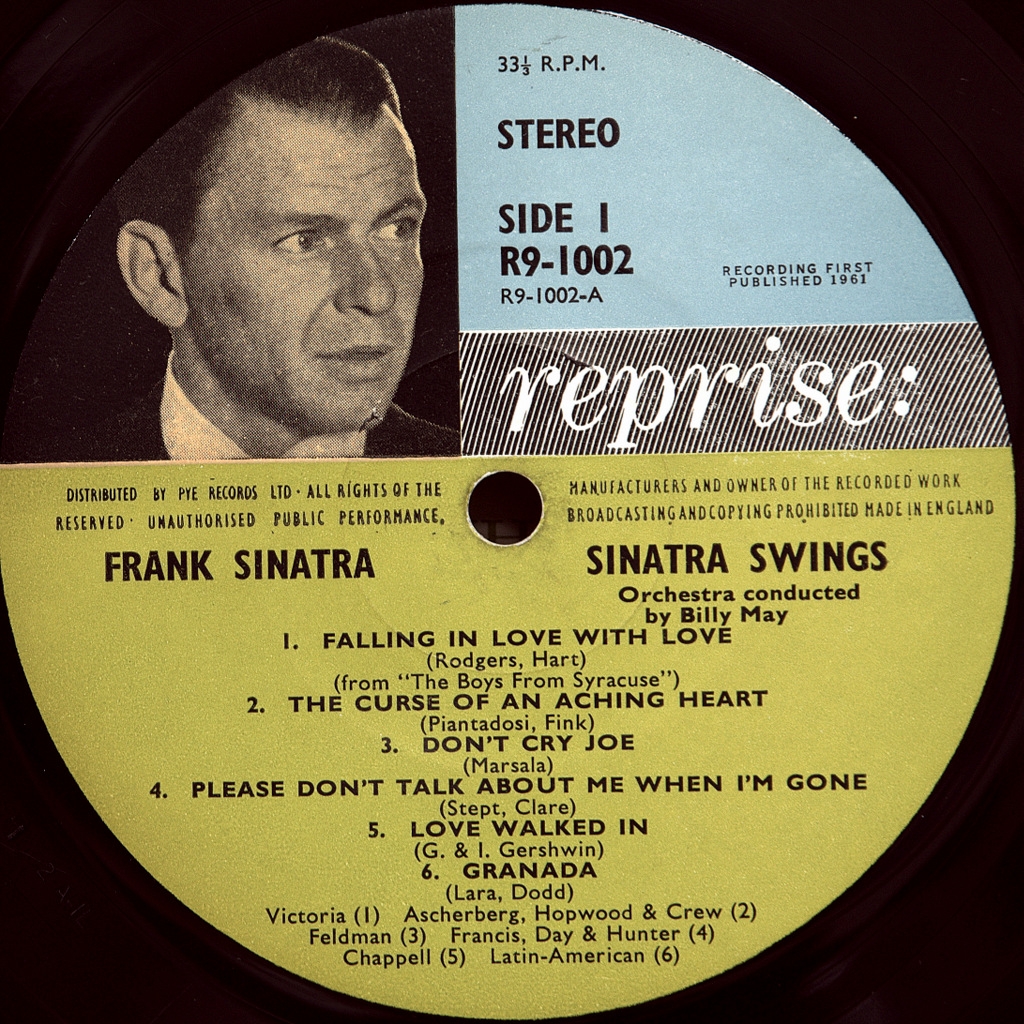 SINATRA, FRANK -SINATRA SWINGS-1961-ПЕРВЫЙ ПРЕСС (STEREO) UK-REPRISE-R9-10002. Редкий британский оригинал культового альбома. Sinatra Swings (первоначально назывался "Качайся вместе со мной") - альбом Фрэнка Синатры с Билли Мэем и его оркестром, выпущенный в 1961 году. Два названия альбома проистекают из того факта, что Capitol считал, что этот альбом, первоначально названный "Качайся вместе со мной", был так близок по звучанию и названию к более раннему альбому Синатры "Capitol "" Давай качайся со мной!" что лейбл добивался и был удовлетворен судебным постановлением, требующим от Reprise изменить название этого, только его второго альбома Reprise, на Sinatra Swings. Повторной печати не требовалось, чтобы отозвать уже отгруженные пластинки, но пришлось печатать новые этикетки и обложки, На обложке альбома было объявлено, что он содержит "двенадцать самых раскованных вещей Синатры, когда-либо записанных". Треки были аранжированы и дирижированы Билли Мэем и его оркестром. У Синатры был небольшой хит с синглом "Гранада", включенным в этот альбом.