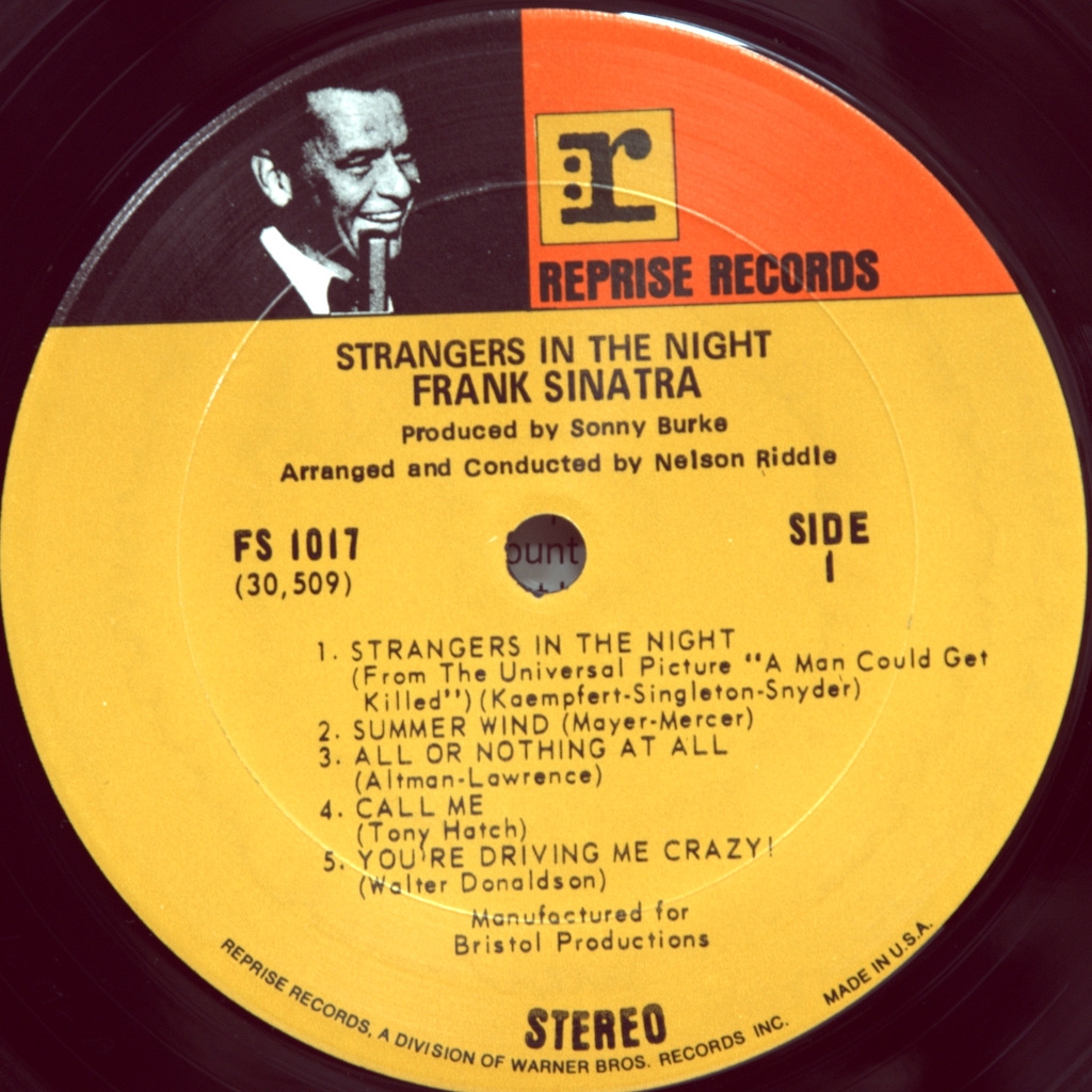 SINATRA, FRANK - STRANGERS IN THE NIGHT-1966-ВТОРОЙ ПРЕСС (STEREO) USA-REPRISE- FS1017. Редкий американский оригинал второго издания культового альбома. На церемонии вручения премии «Грэмми» 1967 года Sinatra получил две премии «Грэмми» за свои усилия в этом альбоме, включая « Рекорд года» за заглавный трек, а также за лучшее мужское вокальное исполнение за ту же песню. (В том же году он получил еще одну премию «Грэмми» - « Альбом года для мужчины и его музыки» ). Аранжировка Ernie Freeman к заглавному треку принесла ему премию Грэмми за лучшую аранжировку в сопровождении вокалиста или инструменталиста Это последний альбом, который Sinatra исполнил с давним аранжировщиком / дирижером Nelson Riddle и его оркестром. "Strangers in the Night" стал платиновым за миллион проданных копий в США.