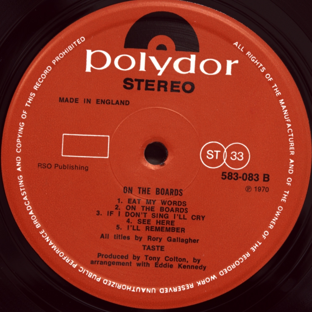 TASTE - ON THE BOARDS -1970- ВТОРОЙ ПРЕСС 1971 UK-POLYDOR-583083. Матрицы A-1/B-1 . Редкий британский оригинал блюзовой группы TASTE.On the Boards — второй альбом ирландской рок-группы Taste, выпущенный 9 января 1970 года после записи, которая состоялась 13 месяцами ранее, в декабре 1968 года. Это их последний студийный альбом, который принёс Рори Галлахеру известность, заняв 18-е место в британском чарте альбомов.[4] Рецензенты высоко оценили его разнообразие и точность ансамблевой игры, а также отметили джазовые интонации в игре Галлахера на гитаре и его неподражаемый вокал. Лестер Бэнгс назвал его «впечатляющим... прогрессивным блюзом».