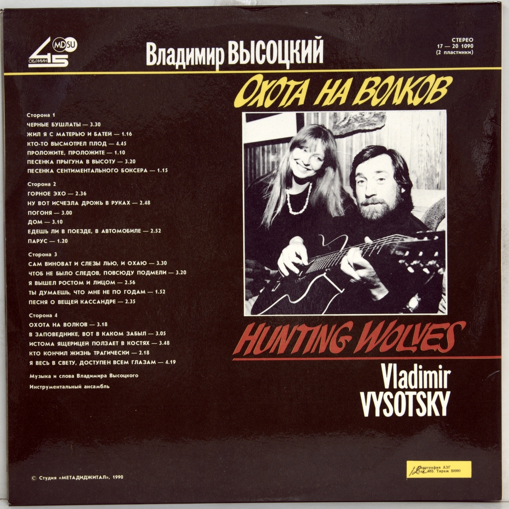 ВЫСОЦКИЙ ВЛАДИМИР ( VISOTSKY VLADIMIR) -ОХОТА НА ВОЛКОВ (2LP'S)-1990-ПЕРВЫЙ ПРЕСС USSR-MDSU-17-201090. Охота На Волков - сборник песен Владимира Высоцкого, вышедший в 1990 году. В сборник вошли такие песни как "Черные Бушлаты", "Песенка Прыгуна В Высоту", "Песня О Вещей Кассандре", "Охота На Волков" и другие. Издание на двойном чёрном виниле в разворотном ламинированном конверте. Скорость вращения 45 RPM. Лейблы красные. Владимир Высоцкий - советский поэт, автор и исполнитель песен, актёр театра и кино. Лауреат Государственной премии СССР ("за создание образа Жеглова в телевизионном художественном фильме "Место встречи изменить нельзя" и авторское исполнение песен", 1987 год, посмертно).