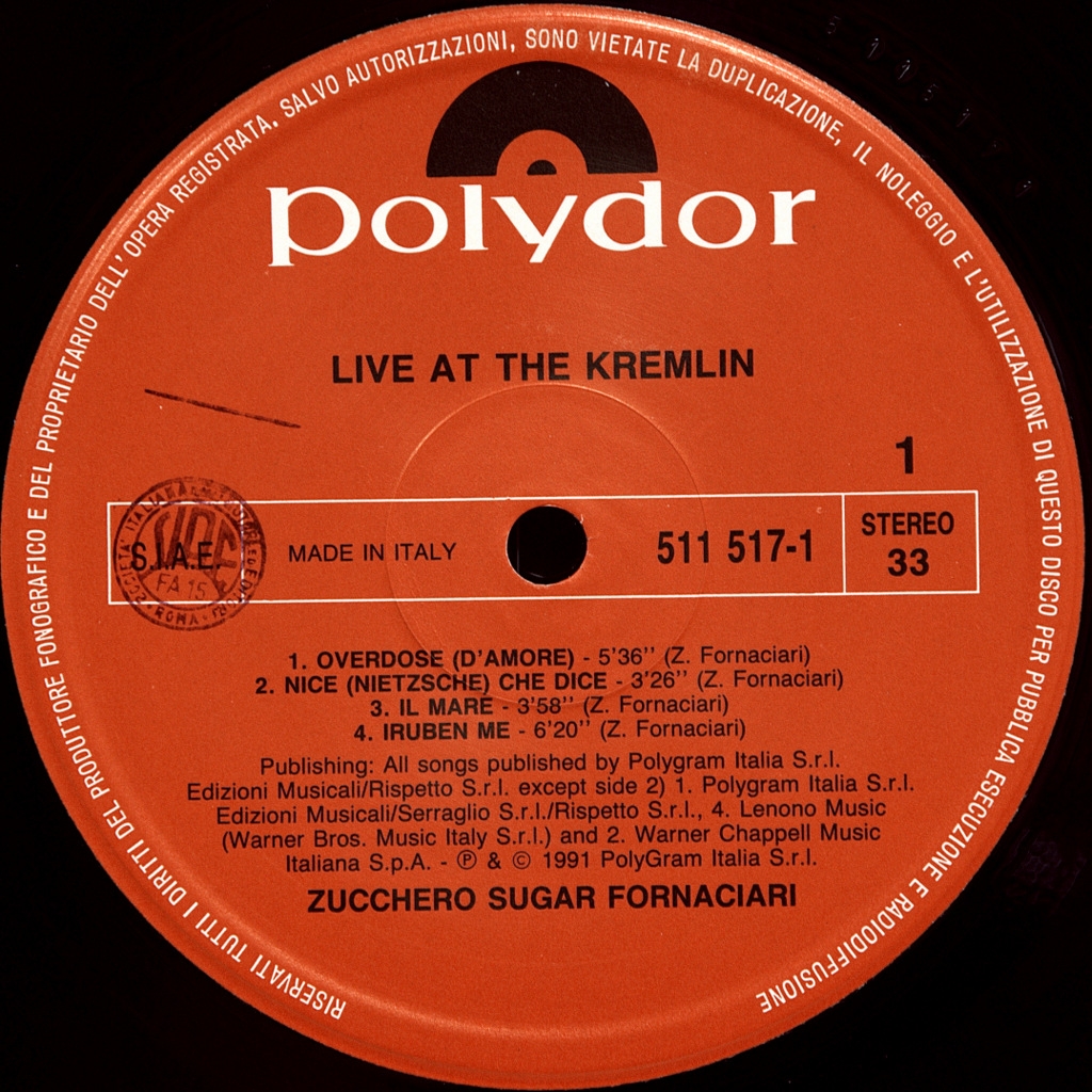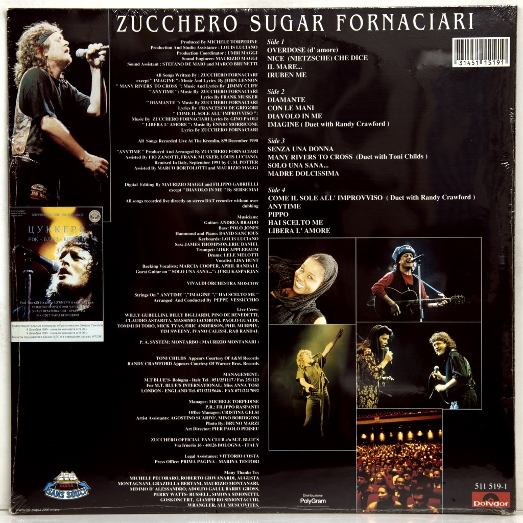 ZUCCHERO-LIVE AT THE KREMLIN (2LP'S)-1991-ПЕРВЫЙ ПРЕСС ITALY-POLYDOR-511519-1.. Редкий оригинал итальянского романтика блюз-рока. Zucchero — Live At The Kremlin — первый концертный альбом итальянского певца Зуккеро Форнациари, выпущенный 4 ноября 1991 года лейблом Polydor. После выхода его одноимённого альбома «Oro, Incenso e Beer», он отправляется в Москву кульминацией которого стал двойной концерт в Московском Кремле, в Конгресс-холле. Второй концерт 9 декабря 1990 года транслировался в прямом эфире по всему миру на Rai Due. Концерт был записан и смикширован Маурицио Магги и выпущен в полном объёме без каких-либо изменений или технической коррекции. Как он написал в своей автобиографии под названием «Звук воскресенья — роман моей жизни», Цукеро давал концерт, испытывая сильную паническую атаку. Тем не менее выступление, первое для западного артиста в Советском Союзе после падения Берлинской стены, прошло успешно. Среди гостей на сцене были Рэнди Кроуфорд, который спел дуэтом с Цукеро «Come Il Sole» на английском языке, и Джон Леннон, которому была посвящена песня «Imagine», посвящённая знаменитому музыканту в десятую годовщину его смерти. Затем появляется Тони Чайлдс, с которым Зуккеро исполняет «Many Rivers To Cross», и Юрий Каспарян, гитарист легендарной советской рок-группы «Кино», который принял участие в концерте со своей гитарой вместе с Андреа Брайдо. Наконец, стоит отметить вклад певицы Лизы Хант, которая сопровождала песни своим проникновенным вокалом и особенно выделилась в исполнении Madre Dolcissima. Во время концерта, как и полагалось по советскому обычаю, не было аплодисментов, но в конце зрители аплодировали стоя в течение 20 минут.