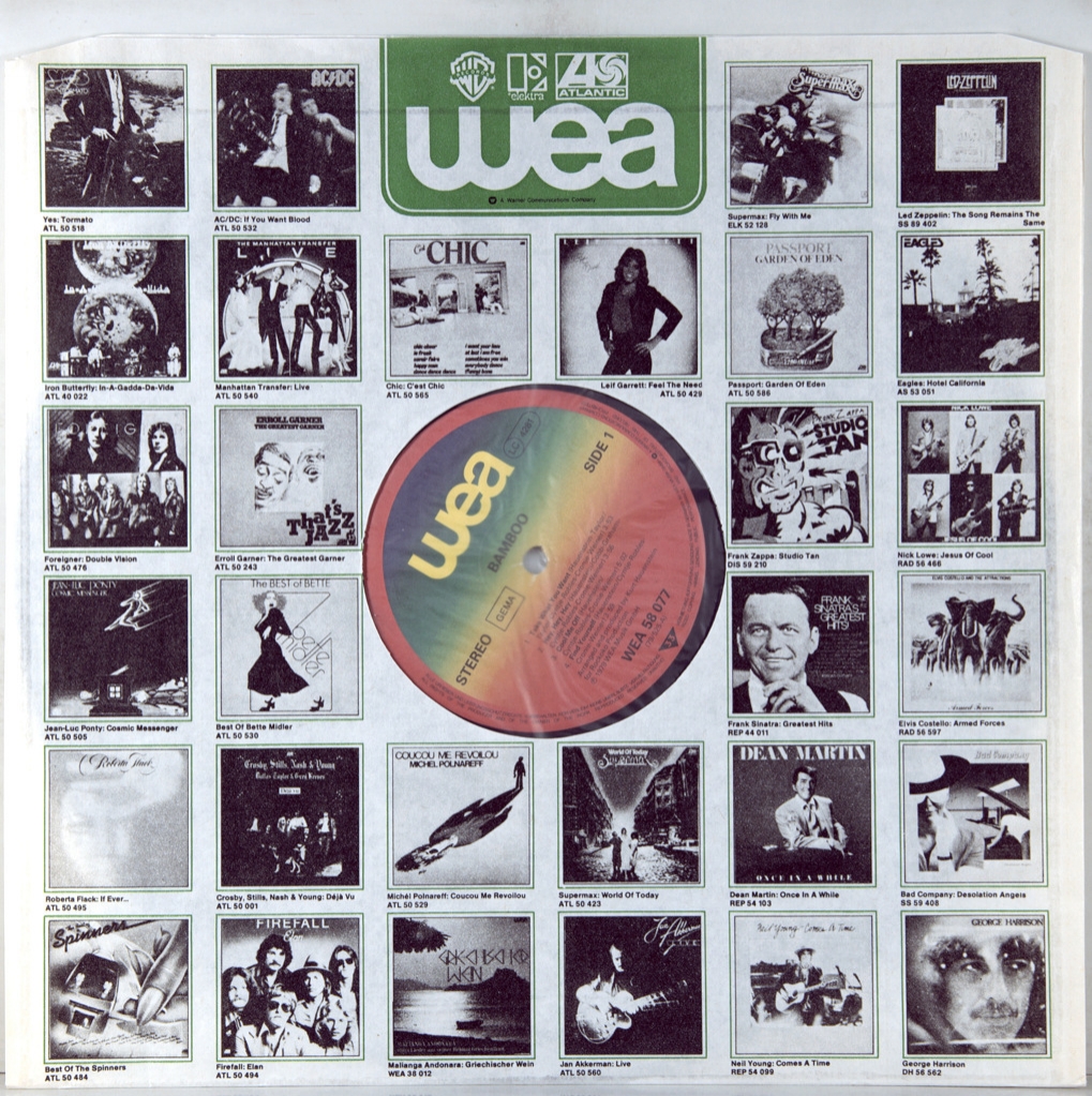 BAMBOO (SUPERMAX) -BAMBOO-1979-ПЕРВЫЙ ПРЕСС GERMANY-WEA-WEA58077. Мега редкий оригинал культового альбома проекта KURT HAUENSTEIN (SUPERMAX). «BAMBOO» – сайд-проект Курта Хауэнштайна - лидера и создателя группы "Supermax" и вокалисток из Суринама. В этом проекте Хауэнштайн отказался от мужского (собственного) вокала в пользу женского. Видна его концепция «сделать нечто поуниверсальней». Проект обустроен всецело по супермаксовым рецептам. Курт сочинил, аранжировал, да и сыграл в основном всё сам (бас, синтезаторы и прочие клавишные). Помимо трёх вокалисток ему помогают два перкуссиониста и ударник, плюс ещё двое значатся на подпевках. Результат – синтезаторный диско-фанк, однако музыкальная эстетика «идеологически» ближе к диско (в густо-синтезаторной его версии) с важным отличием от массового пошиба, ибо грув ударных поизысканней, бас, естественно, тоже не прост. Классический симбиоз диско с реггей также в наличии. В итоге: восемь вещей, а альбом идёт ровно и уверенно. Может быть «функциональной музыкой», как для танцевальных нужд, так и, как ни странно, для спокойного фонового звучания. Для вдумчивого прослушивания тоже сгодится – везде много интересного, в деталях и их сочетаниях.