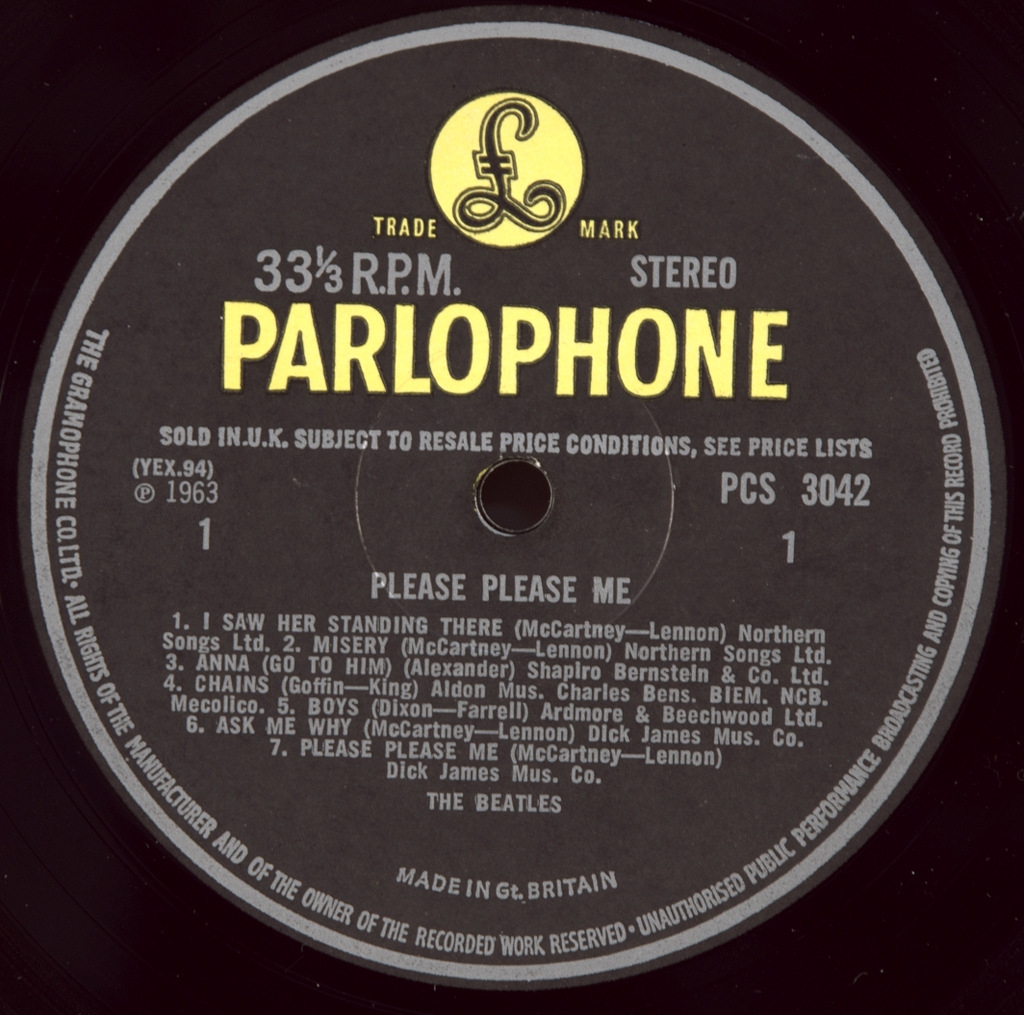BEATLES-PLEASE PLEASE ME-1963-ШЕСТОЕ ИЗДАНИЕ 1965(СТЕРЕО) -UK-PARLOPHONE- PCS3042.Матричные номера: Сторона 1: YEX 94-1; Сторона 2: YEX 95-1. Шестой прессование, 1965 до 1969 года .Гаррод / Лофтхаус Лтд. стойка ламинированная обложка, с небольшими “стерео” на фронте. Черная этикетка с желтым логотипом и серебристым принтом. “Граммофон Со. ЛТД.” напечатано в начале периметру печати и “продается в Великобритании...” текст. Калька-на подкладке “использовать Emitex” ,С или без Налогового кодекса КТ на этикетке.