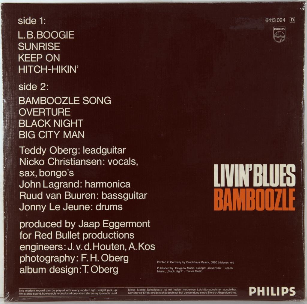 LIVIN' BLUES-BAMBOOZLE-1972-ПЕРВЫЙ ПРЕСС GERMANY-PHILIPS-6413 024, Очень редкий оригинал культового блюзового альбома, голландской группы. Livin' Blues — Bamboozle (1972) Третий студийный альбом голландской группы Livin’ Blues, выпущенный в 1972 году на лейбле Philips. Авторами почти всех песен выступили Оберг и Кристиансен, за исключением великолепно сыгранной “Overture” Эндрю Ллойда Уэббера и кавера на песню американского музыканта J.M. Robinson “Black Night”. Музыканты делали ставку на очередной хит “L.B. Boogie”, задавший настроение всему альбому. А он получился бойким и ярким – восемь композиций от буги-рока до ритм-энд-блюза. В нем нашлось место и для светлой грусти – инструментальная композиция Теда Оберга “Sunrise”. В 1971 Дик Бекман был вынужден покинуть группу, ему на смену пришёл Джонни Ле Жен (Jonny Le Jeune (ex-Island)), человек игравший на барабанах с 5 лет, участник нескольких голландских коллективов. С ним группа записала свой третий альбом со странным названием Bamboozle. Нового ударника хватило не надолго - на этот альбом, затем он ушёл в Schick Band. Начались туры по Европе , где аранжированный трек "Увертюра" Эндрю Ллойда Уэббера и Тима Райса (из Jesus Christ Superstar) пользовался большим успехом.