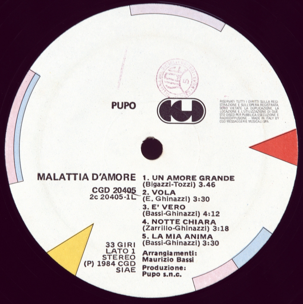PUPO-MALATTIA D'AMORE -1984-ПЕРВЫЙ ПРЕСС ITALY-CGD-20405. Редкий итальянский оригинал культового альбома. Энцо Дзинацци, наиболее известный как Пупо-итальянский певец, автор текстов, телеведущий и писатель. В 1975 году он дебютировал как автор-исполнитель под сценическим псевдонимом Пупо с песней «Ti scriverò» («Я напишу тебе»). Первый альбом Пупо Come sei bella («Ты такая красивая») вышел в 1977 году. Его второй альбом Gelato al cioccolato стал первым крупным успехом исполнителя. В него вошли хиты «Ciao» и «Gelato al cioccolato», написанные в соавторстве с Кристиано Мальджольо; этот альбом стал первым из 11 золотых альбомов исполнителя. В 1980 году Пупо впервые принял участие в музыкальном фестивале в Сан-Ремо с песней, получившей золотой статус, — "Su di noi" ("Над нами"): песня вошла в его третий альбом Più di prima ("Больше, чем раньше"), который стал самым продаваемым альбомом Пупо, а также включал песню "Firenze Santa Maria Novella" — любовное послание городу Флоренция. В 1981 году он написал свой первый хит для другого исполнителя — Sarà perché ti amo, который в том же году исполнили Ricchi e Poveri на фестивале в Сан-Ремо. Пупо снова принял участие в фестивале в 1983 году с песней "Cieli azzurri" ("Голубое небо"), а в 1984 году — с песней "Un amore grande" ("Большая любовь"), написанной Умберто Тоцци и Джанкарло Бигацци. В 1986 году он выпустил альбом Pupo в СССР, который имел большой успех и принёс ему известность в Восточной Европе. В следующем году он выиграл международный фестиваль детской песни Zecchino d'Oro как автор песни «Canzone amica» («Песня о дружбе»). Пупо много гастролировал по всему миру и в 1991 году выпустил свой первый и на сегодняшний день единственный концертный альбом Canada's Wonderland, записанный в Торонто.В 1992 году он в четвёртый раз принял участие в музыкальном фестивале в Сан-Ремо, на этот раз под своим настоящим именем, с духовной песней «La mia preghiera» («Моя молитва»).