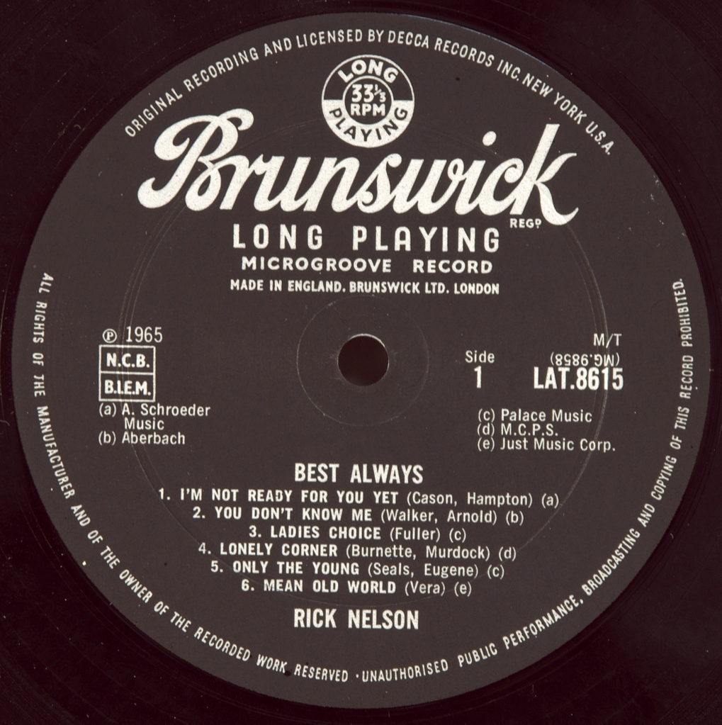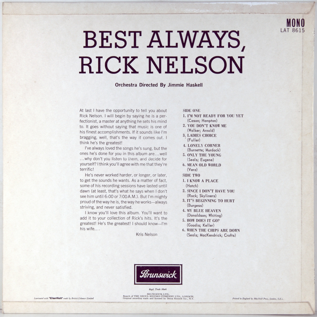 RICK NELSON-BESTALWAYS- 1965-ПЕРВЫЙ ПРЕСС UK-BRUNSWICK-LAT8615. Редкий британский оригинал культового альбома. Best Always — двенадцатый студийный альбом рок-н-ролла и поп-музыки идола Рика Нельсона и его пятый альбом для Decca Records, выпущенный 19 апреля 1965 года. Джимми Хаскелл аранжировал альбом, а Чарльз «Бад» Дант спродюсировал его. Пластинка содержит подборку кавер-версий старых и новых хитов, в том числе четыре песни, которые также попали в чарты: My Blue Heaven в исполнении Фэтса Домино в 1956 году, Since I Don't Have You в исполнении The Skyliners в 1959 году, You Don't Know Me в исполнении Рэя Чарльза в 1962 году и I Know a Place в исполнении Петулы Кларк. Сингл «Mean Old World» дебютировал в чарте Billboard Hot 100 20 марта 1965 года, заняв 96-е место и продержавшись в нём две недели.[1] и 94-е место в чарте синглов Cashbox за неделю.[2] Другой сингл, "Lonely Corner", продержался неделю в чарте Billboard Bubbling Under Hot 100 Singles в выпуске от 29 августа 1964 года, достигнув 113-го места.