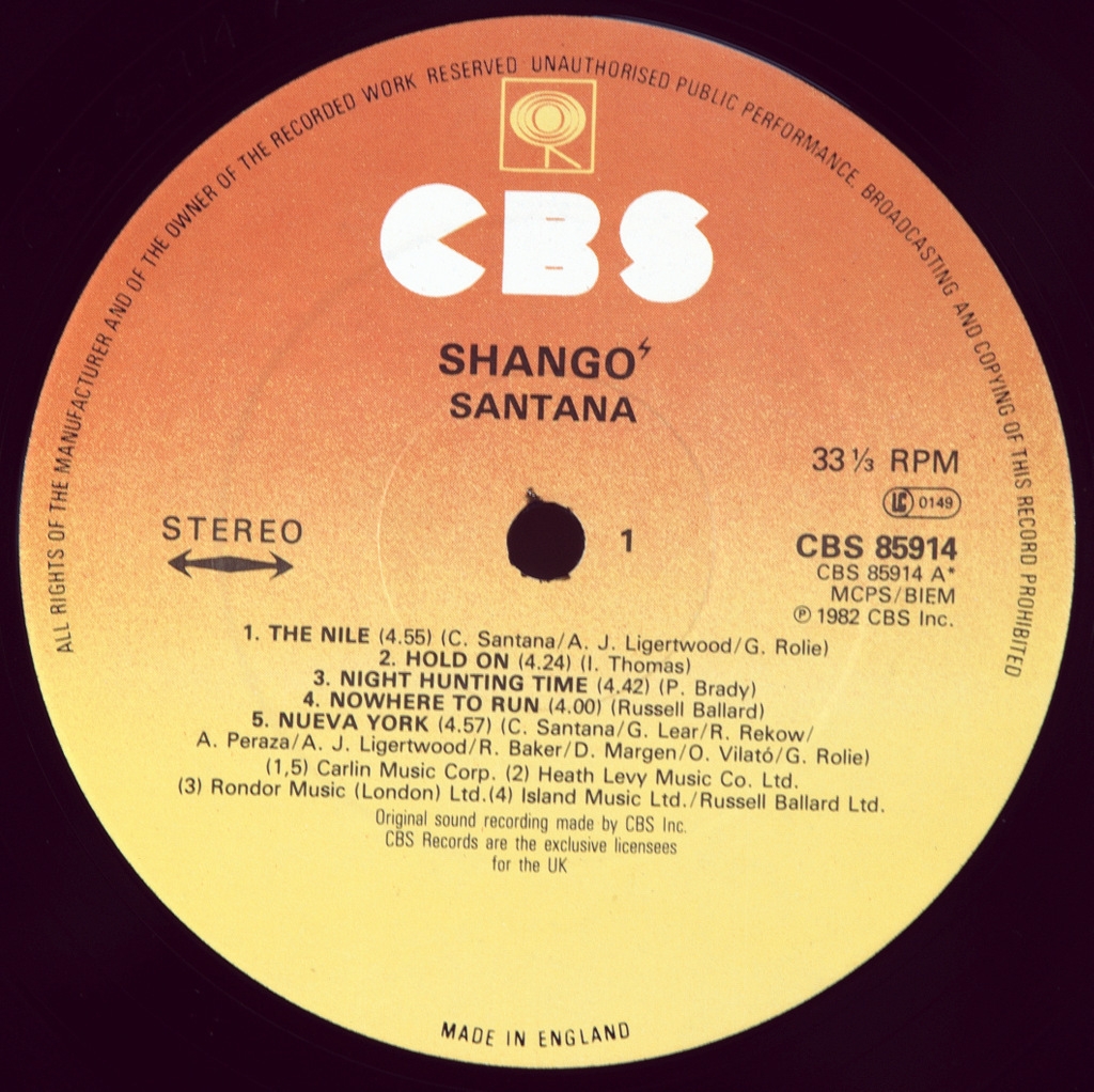 SANTANA-SHANGO-1982-ПЕРВЫЙ ПРЕСС UK-CBS-85914 Редкий британский оригинал легендарного гитариста. Shangó — тринадцатый студийный альбом группы Santana. Альбом занял 22-е место в чарте альбомов Billboard 200. Сингл "Hold On" с альбома занял 15-е место в американском чарте синглов Billboard Hot 100 и 17-е место в чарте Billboard's Top Tracks.. Второй сингл с альбома, "Nowhere to Run", занял 66-е место в чарте Hot 100 и 13-е место в чарте Mainstream Rock, а третий сингл достиг 34-го места в чарте Mainstream Rock.