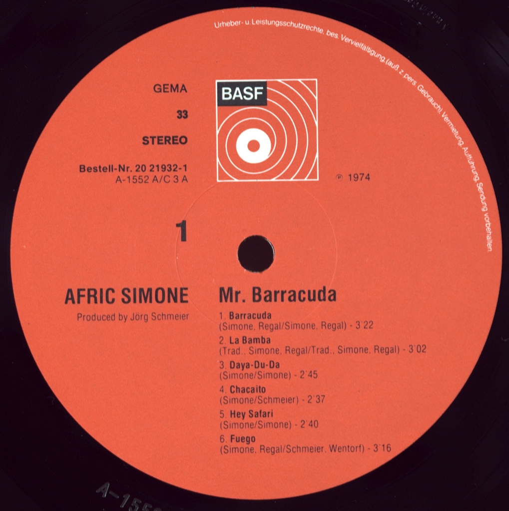 AFRIC SIMONE - MR. BARRACUDA -1974- ПЕРВЫЙ ПРЕСС GERMANY - BASF-2021932-1. Африк Симоне, — мозамбикский вокалист, музыкант, перформансист, мультиинструменталист, танцор и артист. В 1975 году он попал в европейские чарты со своим первым хитом «Рамая», а затем выпустил еще одну известную песню «Хафанана». Симоне достиг пика своей популярности в период с 1975 по 1980 год по обе стороны железного занавеса, поэтому он гастролировал по СССР, Польше, ГДР и Чехословакии в странах Восточного блока и сохраняет свою популярность по всей Европе и сегодня.