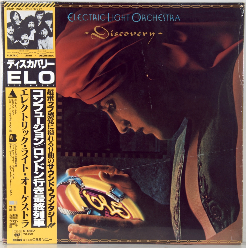 ELECTRIC LIGHT ORCHESTRA-DISCOVERY -1979-THE FIRST JAPAN-JET-25AP-1600 PRESS. A rare Japanese original of a cult album. Discovery is the eighth studio album by the English rock band Electric Light Orchestra (ELO). It was released on May 31, 1979 in the UK by Jet Records, where it topped the record charts, and on June 8 in the United States on Jet through Columbia Records distribution.