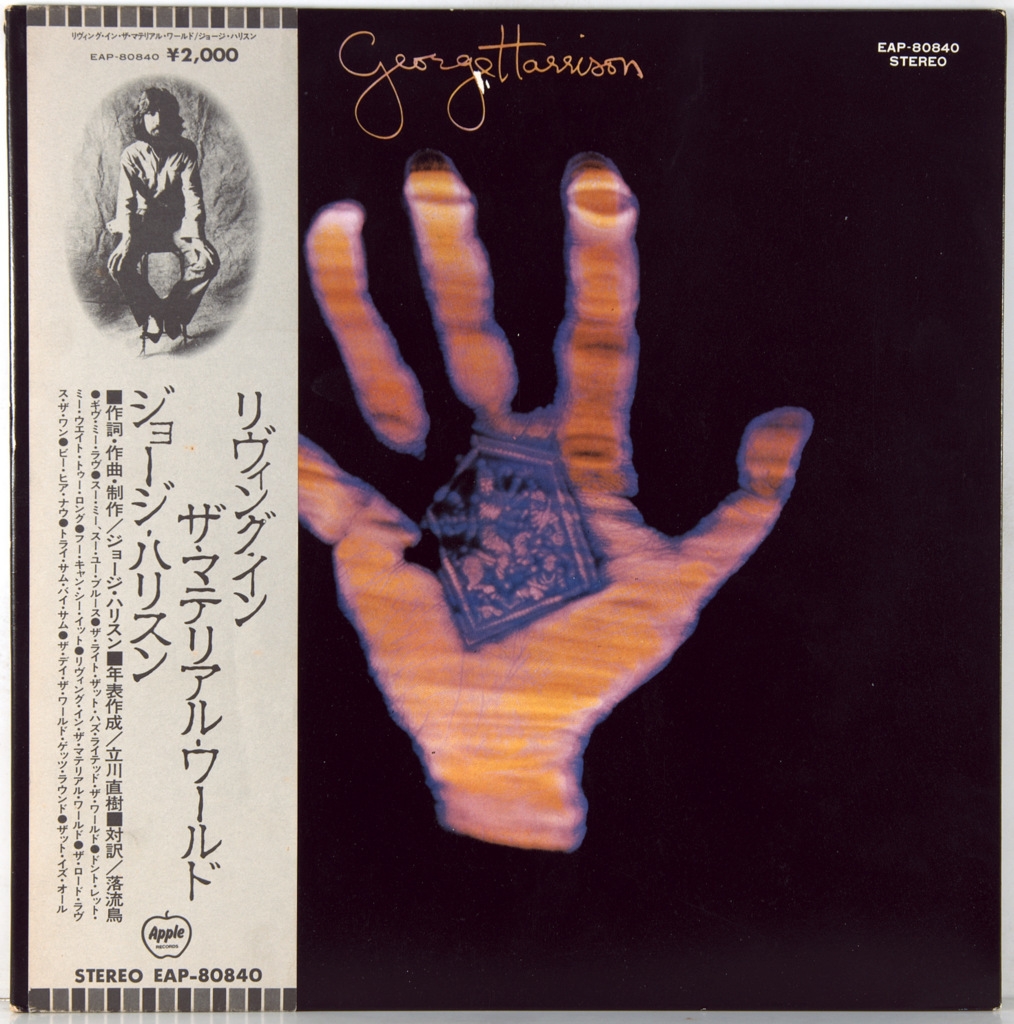 HARRISON, GEORGE-LIVING IN THE MATERIAL WORLD-1973-THE FIRST JAPAN-APPLE-EAP-80840 PRESS. A rare Japanese original of a cult album. Living in the Material World is the fourth studio album by English musician George Harrison, released on May 30, 1973 on Apple Records. As a follow-up to the critically acclaimed 1970s album All Things Must Pass and his groundbreaking charity project Concert for Bangladesh, it was one of the most anticipated releases of that year. The album was certified gold by the Recording Industry Association of America two days after its release, becoming Harrison's second number 1 album in the United States, and spawned the international hit "Give Me Love (Give Me Peace on Earth)". It also topped the album charts in Canada and Australia and reached number 2 in the UK.