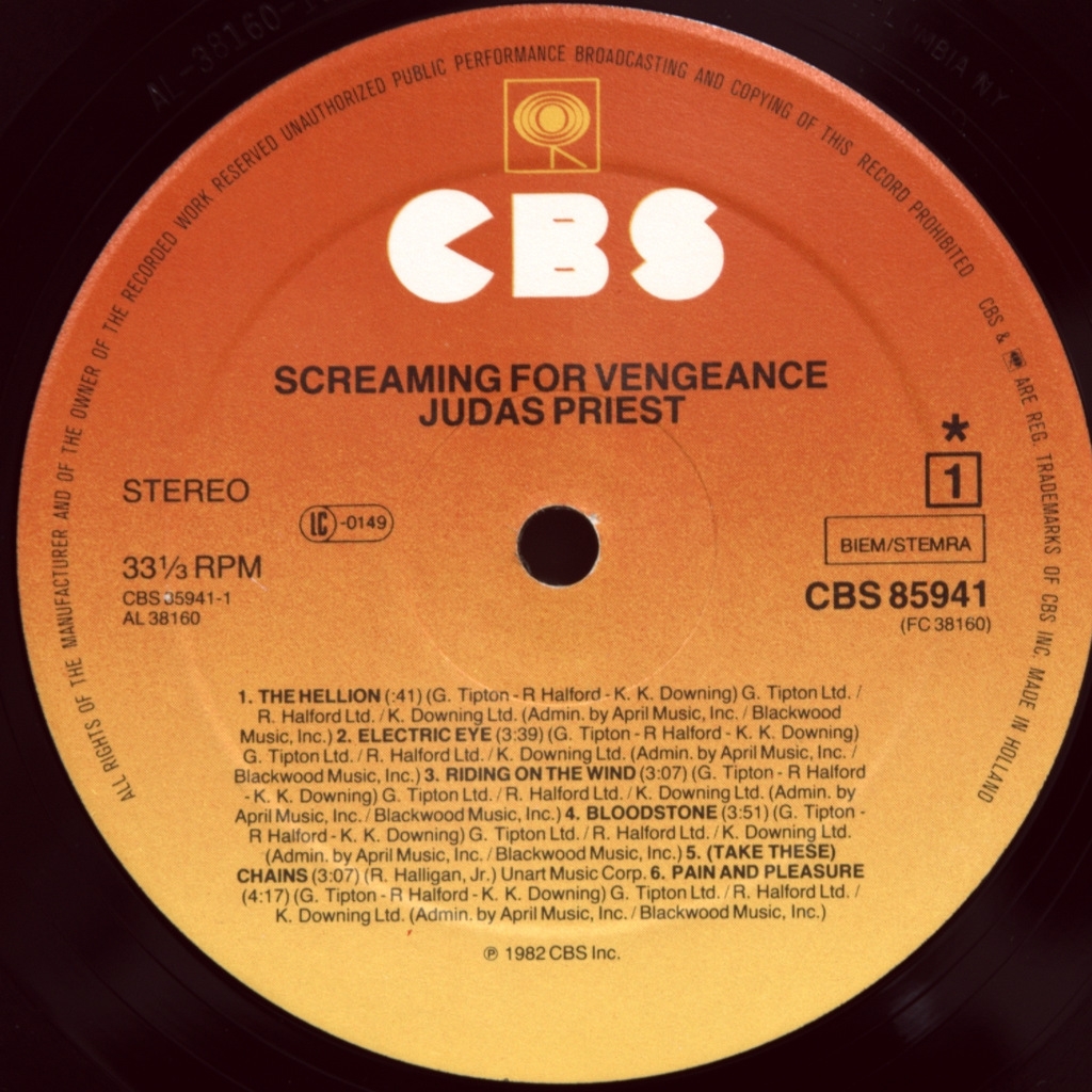 JUDAS PRIEST-SCREAMING FOR VENGEANCE-1982-THE FIRST EU PRESS- HOLLAND-CBS-85941. A rare European original by a cult hard band. Screaming for Vengeance is the eighth studio album by English heavy metal band Judas Priest, released on July 1, 1982 on Columbia Records. It is considered the band's commercial breakthrough in North America and has been certified double platinum in the United States and platinum in Canada. Screaming for Vengeance spawned the hit You've Got Another Thing Comin', which became one of the band's hallmarks and a regular hit on the radio.