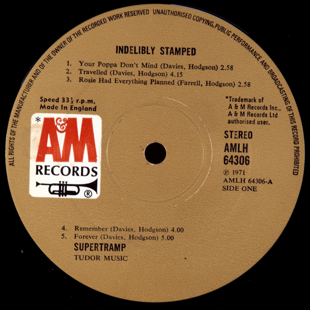 SUPERTRAMP-INDELIBLY STAMPED-1971-THE FIRST UK-AM-AMLH 64306 PRESS. A-1/B-1 matrices. A very rare British original of the cult album. Indelibly Stamped is the second album by the English rock band Supertramp, released in 1971. It marked a drastic change of direction to a more straightforward rock sound, and, according to the band members themselves, "Traveled" is the only song that somehow resembles their debut album. Like their debut album, this album was a commercial failure upon release, but went gold in France and Canada in the following decades. The original editions have a color cover with a flap and other text for the band name and album. The cover depicts a woman with a naked torso and tattoos on her arms. This is Supertramp's first album released in the USA. The album was banned from a number of music stores in Australia, while in other stores each copy was sold in a brown paper envelope.