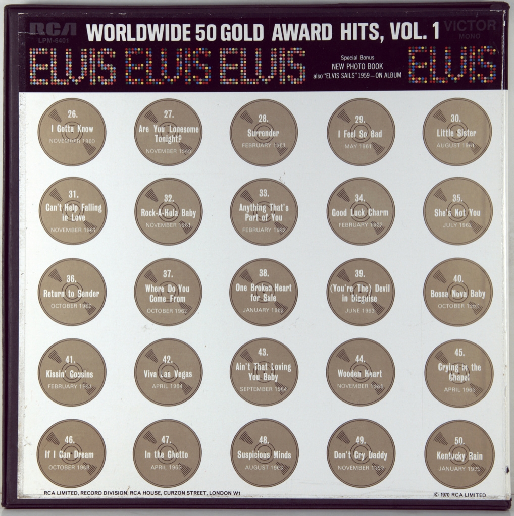 ELVIS PRESLEY-WORLDWIDE 50 GOLD AWARD HITS VOL.1 (BOX-4 LP'S+BOOK)-1970-THE FIRST UK PRESS-RCA -LPM-6401.. A rare English original . Worldwide 50 Gold Award Hits Vol. 1 is a compilation album by American singer and musician Elvis Presley. This four-lp compilation was released in August 1970 and became his 38th album. The compilation reached number 45 on the Billboard 200 chart and number 25 on the country chart. The album received gold status on February 13, 1973, platinum status on March 27, 1992, and double platinum status from the American Recording Industry Association on June 17, 1992. Of the 51 tracks featured, four are being played for the first time in this collection: "Viva Las Vegas", "Suspicious Minds", "Don't Cry Daddy" and "Kentucky Rain". The collection also includes an excerpt from a long-unreleased EP with lyrics performed by the author Elvis Sails. All tracks in this set are presented in mono format.