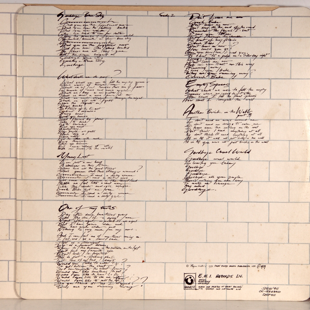 PINK FLOYD-THE WALL (2VINYL)-1979-THE FIRST UK HARVEST PRESS - SHDW411 Matrices A-2U/B-3U/C-1U/D-2U (Very early!!!!) The Wall is the eleventh studio album by British progressive rock band Pink Floyd. It was released on November 30, 1979 on two discs. This is the last release of the band, recorded in a classic line-up.: David Gilmour (guitar), Roger Waters (bass), Nick Mason (drums) and Richard Wright (keyboards). The Wall was one of the most commercially successful albums of 1980, reaching the top of several charts, including Billboard; by 1999, it had sold over 23 million copies in the United States, making The Wall one of the three best-selling albums in the United States. Rolling Stone magazine ranked this record 87th in its list of the "500 Greatest Albums of All Time."