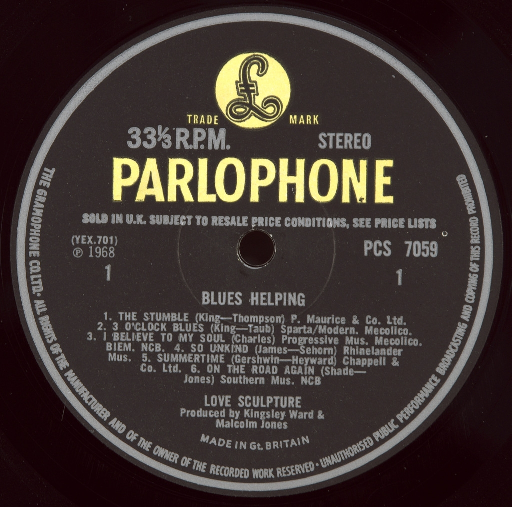 LOVE SCULPTURE-BLUES HELPING-1968-FIRST PRESS UK-PARLOPHONE-PCS7059. A very rare British original of the cult band. Their debut album Blues Helping included the songs "Summertime" and "Wang Dang Doodle".