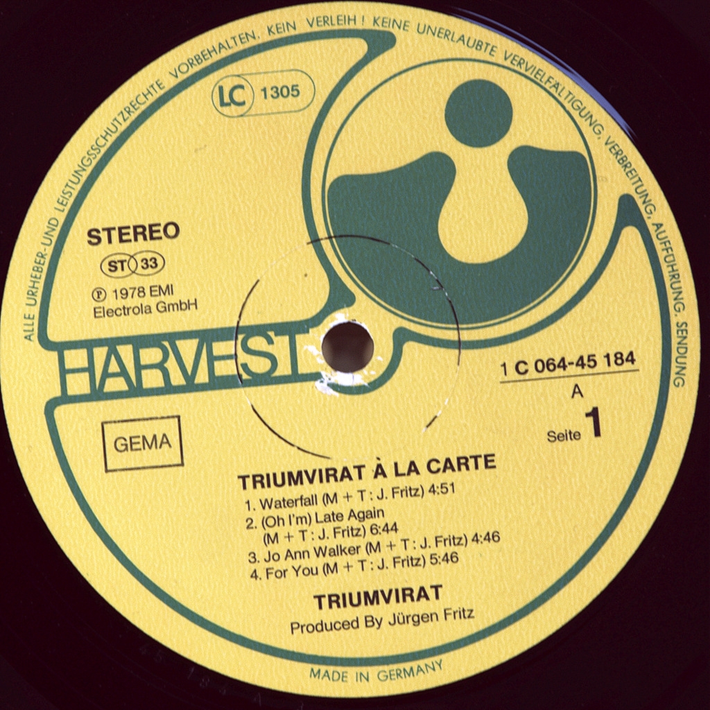 TRIUMVIRAT-A LA CARTE-1978-ПЕРВЫЙ ПРЕСС GERMANY-HARVEST-1C064-45184. Редкий германский оригинал культовой прог группы. A la Carte - 6-й студийный и предпоследний альбом группы . "A La Carte" состоит из девяти треков и полностью отличается от их предыдущих пяти студийных альбомов, это даже больше похоже на совершенно другую группу. Устоявшийся стиль симфо-прогрессивного рока The Nice и Emerson, Lake and Palmer внезапно отброшен на этом альбоме, равно как и виртуозные клавишные игры лидера группы Юргена Фрица. Вместо них у нас есть коллекция мелодий в стиле поп-рок, которые заменили напыщенность и богатство прежних аранжировок, на музыкальные произведения в духе Supertramp. Несомненно, альбом отражает наиболее коммерческое значение группы в те дни и превращает альбом в настоящий праздник поп-рока. Хотя создание поп-альбома не является грехом. Великие музыканты, такие как Ханс-Юрген Фриц, исполняют поп-песни так, как другие поп-исполнители могут только мечтать. Кто выигрывает от этого, так это поп-музыка. Хороший альбом, который просто не стоит сравнивать с первыми альбомами группы.