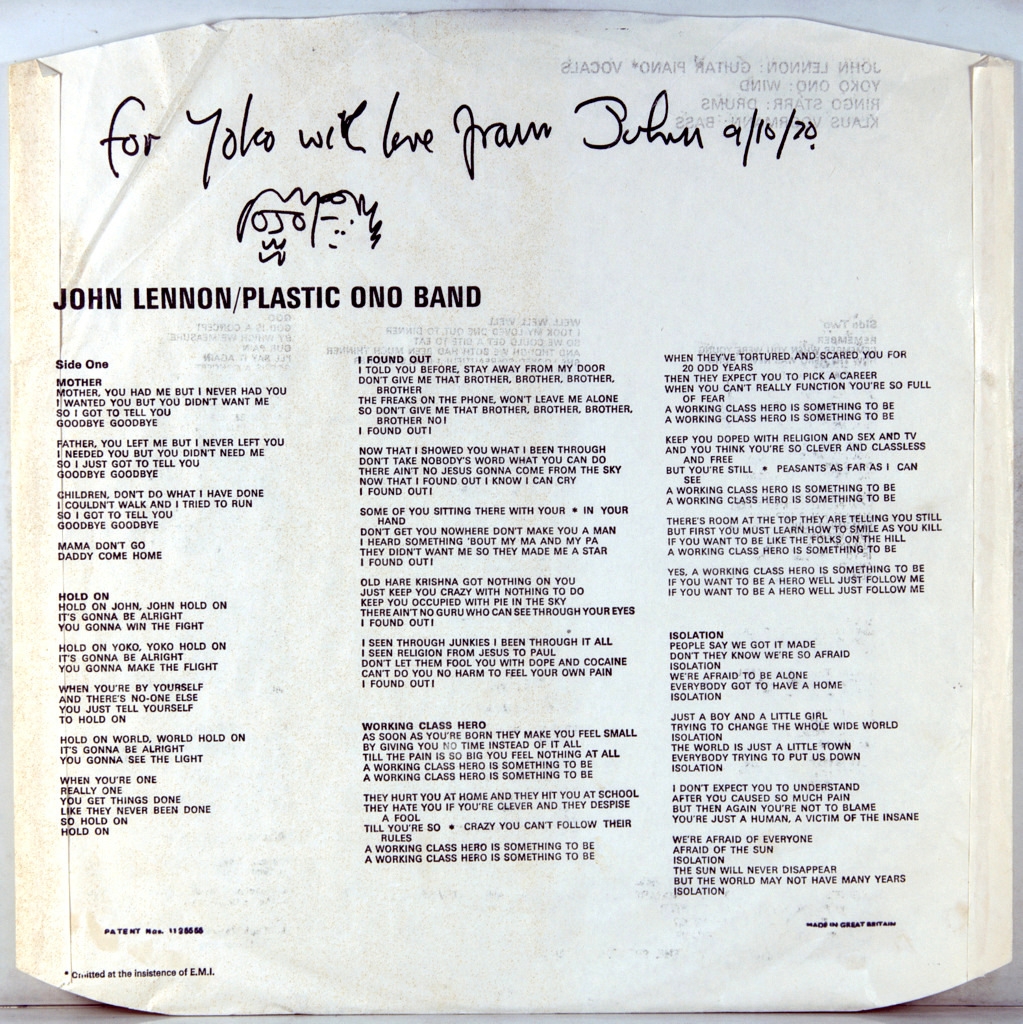 LENNON, JOHN AND YOKO ONO-PLASTIC ONO BAND-1970-ПЕРВЫЙ ПРЕСС (СТАНДАРТ ВЕРСИЯ) UK-APPLE- PCS7124. Матрицы A-1U/B-1U Стандартная версия - без кредитов Maclen (Music) Ltd. на лейблах. Первый сольный альбом LENNON и ONO в версии LENNON JOHN.John Lennon/Plastic Ono Band — первый официальный сольный альбом Джона Леннона, выпущенный в 1970 году.Обложка альбома почти идентична обложке альбома Йоко Оно «Yoko Ono/Plastic Ono Band». Различия заключается в том, что на альбоме «Yoko Ono/Plastic Ono Band» Йоко лежит на теле Леннона, а на альбоме «John Lennon/Plastic Ono Band» наоборот.На обратной стороне обложки в оригинальном издании не был поставлен трек-лист альбома, взамен этого, на задней стороне альбома, была помещена фотография Джона Леннона в школьном возрасте, приблизительно в 1946 году.Plastic Ono Band - Супергруппа, сформированная Джоном Ленноном и Йоко Оно в 1969 году. Среди различных членов группы были Эрик Клэптон, два бывших участника The Beatles, старый друг Клаус Вурманн, будущий барабанщик группы Yes Алан Уайт, Делани и Бонни, барабанщик группы The Who Кит Мун, Нью-Йоркская группа Elephant's Memory, Билли Престон, Ники Хопкинс, Фил Спектор, и барабанщик Джим Кельтнер