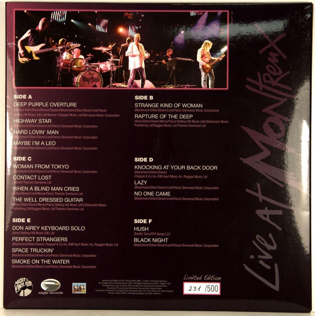 DEEP PURPLE-LIVE AT MONTREUX 2011 (3 × Vinyl, LP, Album, Limited Edition 231/500 Purple Glitter ) -2012-ПЕРВЫЙ ПРЕСС UK-NIGHT OF THE VINYL DEAD номер NIGHT128 Очень редкий лимитированный альбом 231 из 500 изданный. Коцерт в Швейцарии (Монтрей) прошел в 2011 году.