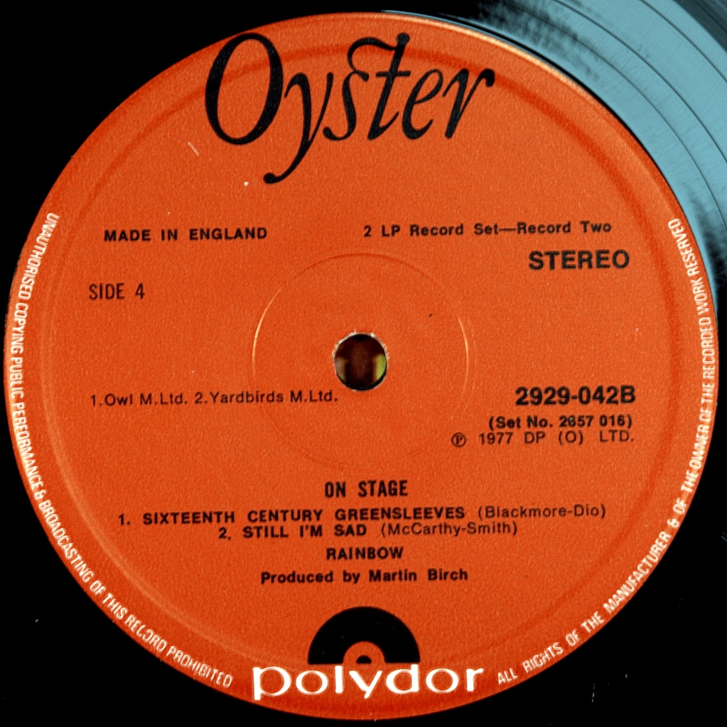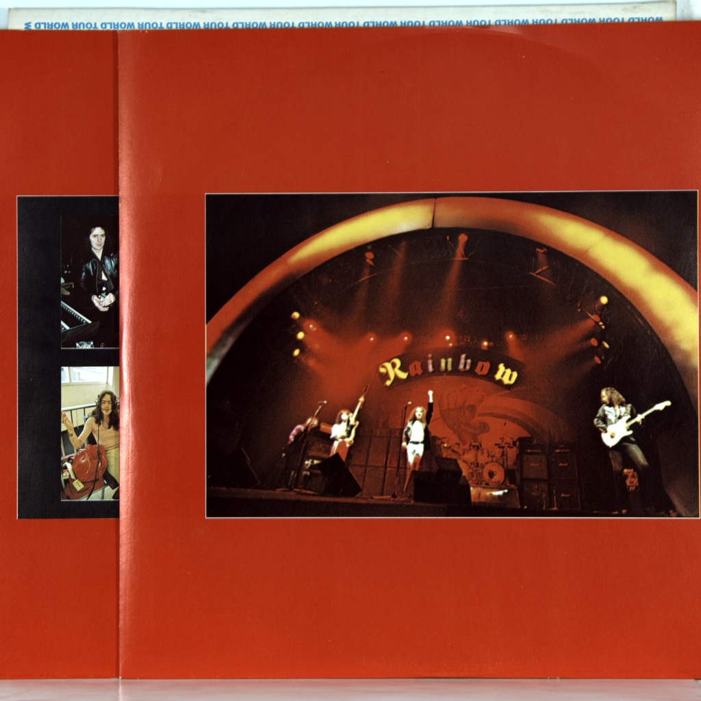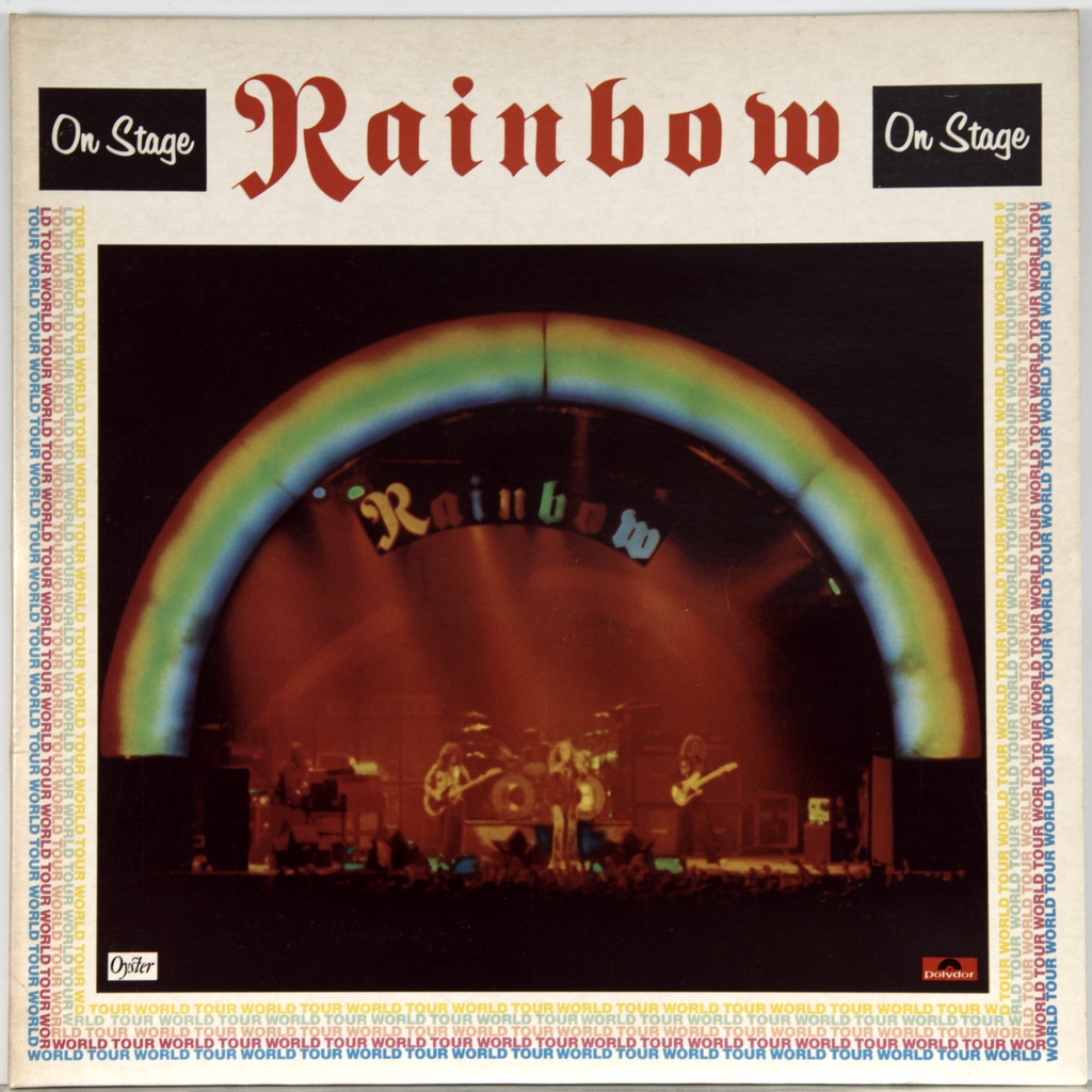 RAINBOW-ON STAGE (2 LP'S)-1977-ПЕРВЫЙ ПРЕСС UK-POLYDOR OYSTER- 2657016,2929-041/42 Матрицы A-1/B-2/A-7/B-7 Masterdisc G.K. On Stage — концертный альбом британско-американской группы Rainbow, выпущенный в 1977 году. В альбом вошли композиции, записанные во время концертов в Германии и Японии в ходе концертного тура в поддержку альбома Rising в 1976 году. Некоторые треки являют собой слияние версий песни с разных концертов. Кроме того, длительность композиций была откорректирована для того, чтобы уместить их на четыре стороны винилового издания.