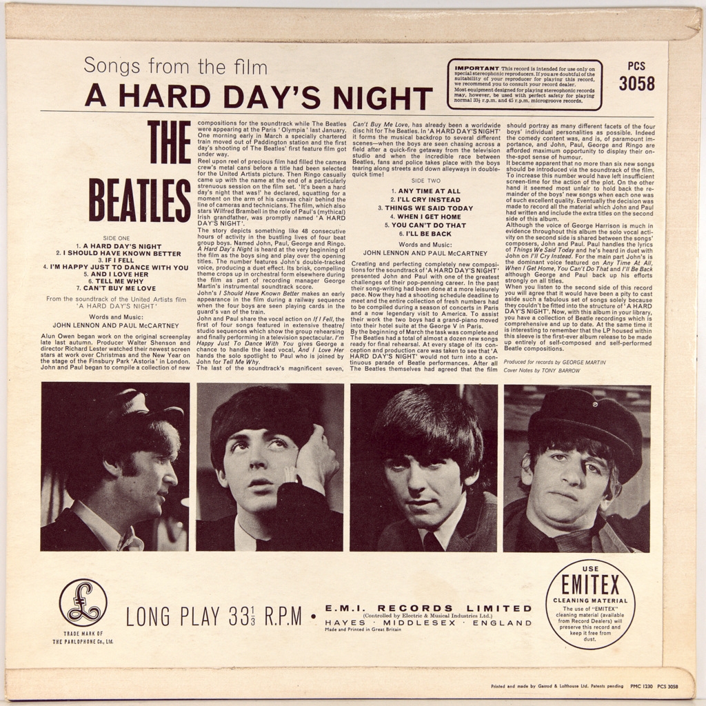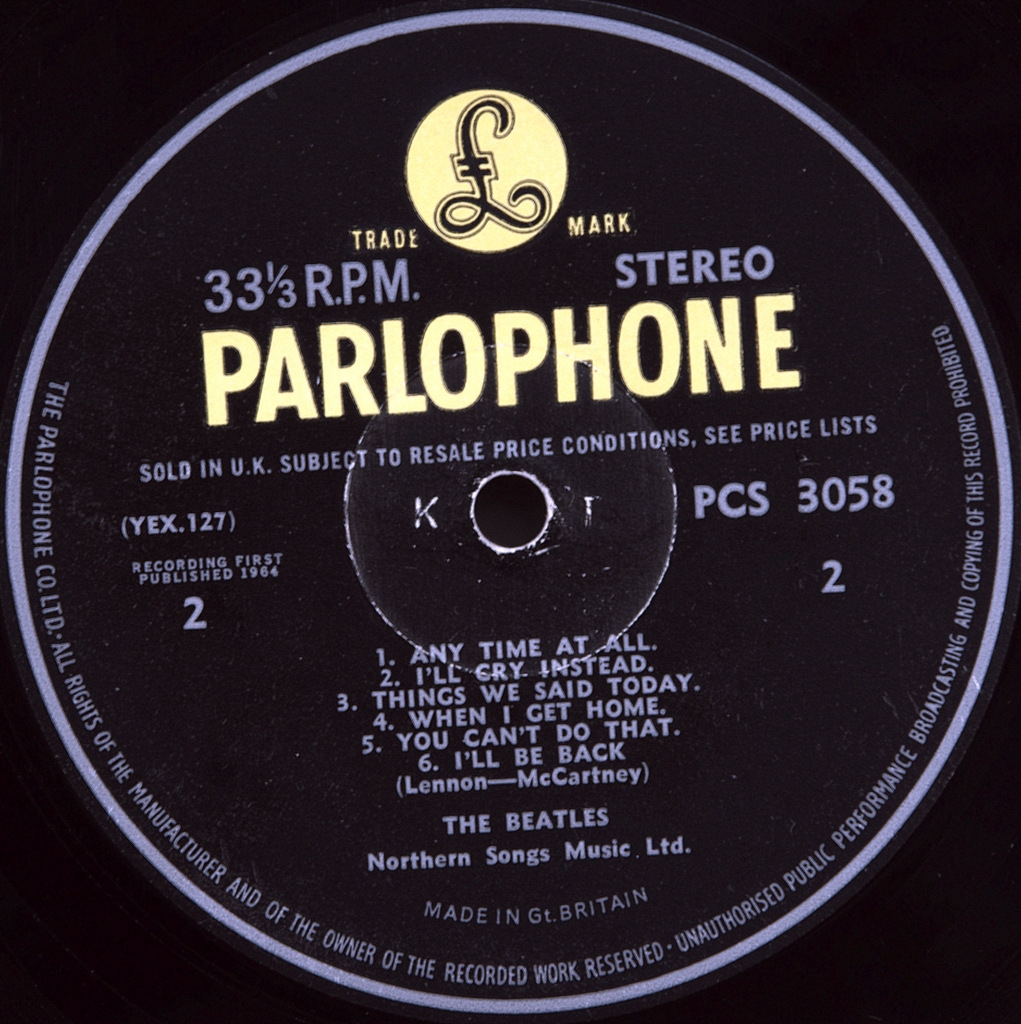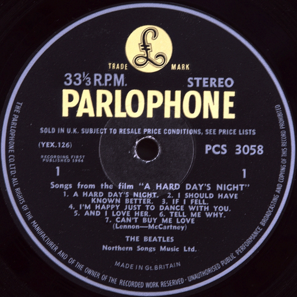 BEATLES-A HARD DAY'S NIGHT (STEREO)-1964-ПЕРВЫЙ ПРЕСС UK-PARLOPHONE-номер PCS 3058. Матричные номера: Сторона 1: YEX 126-1; Сторона 2: YEX 127-1. стампера 3RM/2GP (Рано!)Первый пресс10 июля 1964 года. Черная этикетка с желтым логотипом и серебристым принтом. “ Парлофон Со. ЛТД.” напечатано в начале периметру печати. "Запись впервые опубликована 1964" и "продано в Великобритании на тему..." С или без налогового кодекса КТ на этикетке.