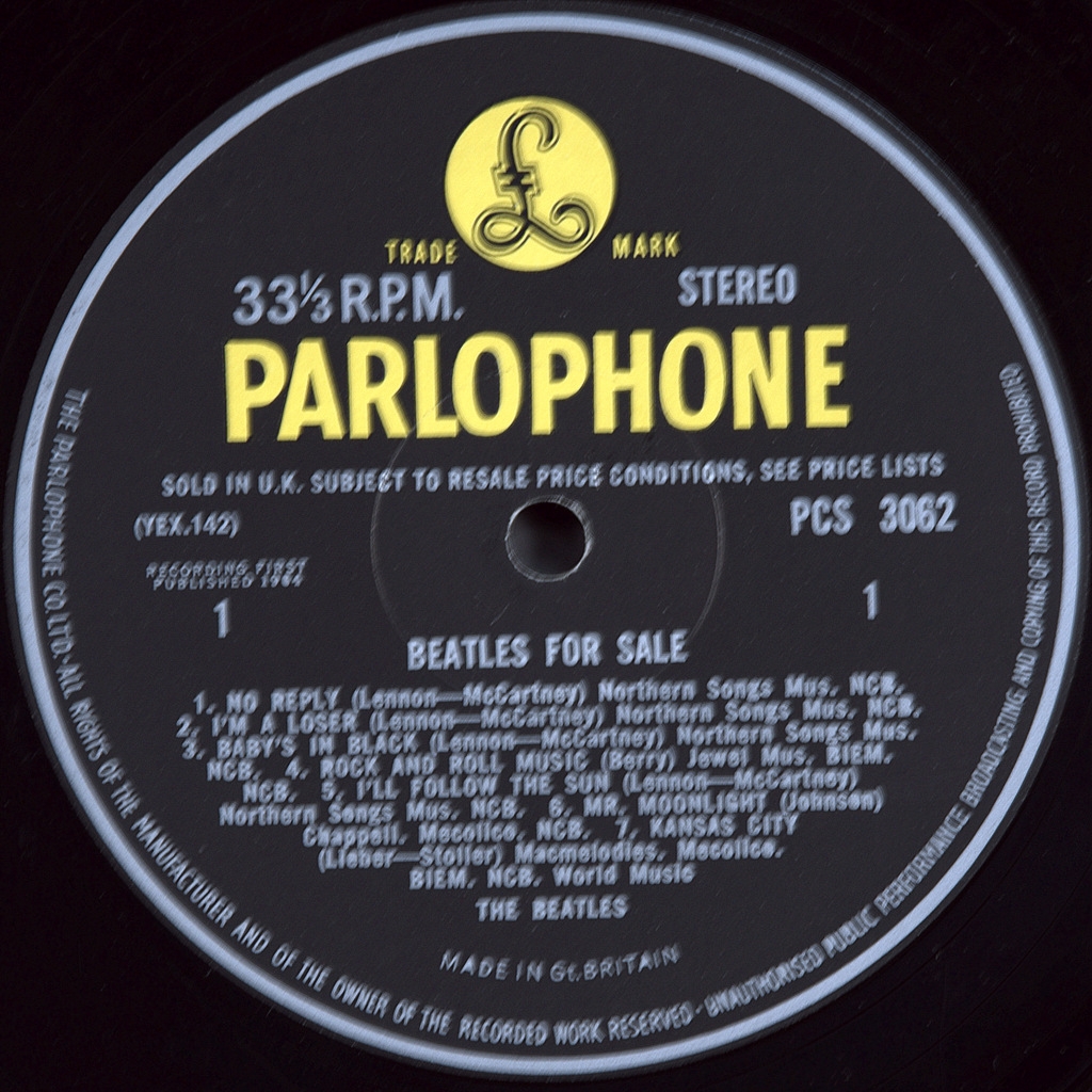Первый пресс напечатан 4 декабря 1964. Черная этикетка с желтым логотипом и серебристым принтом. “PARLOPHONE CO.. LTD." напечатано по периметру. "FIRST PUBLISHING 1964" и "SOLD IN UK........" текст. Вкладка “USED EMITEX" Лейбл с налоговым кодексом КТ или без него .