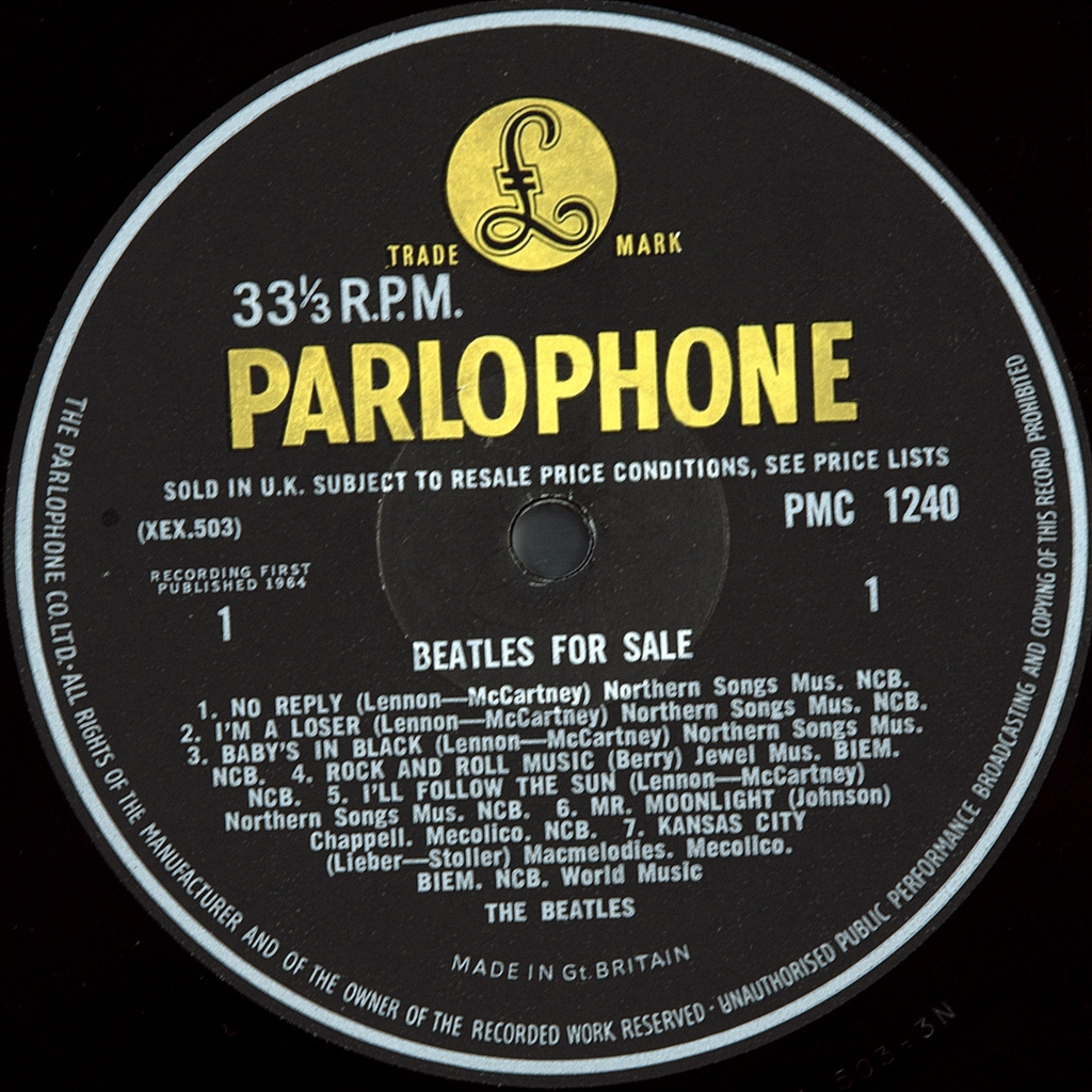 BEATLES-FOR SALE-1964-ПЕРВЫЙ ПРЕСС (МОНО)UK-PARLOPHONE- номер PMC1240 Матричные номера: Сторона 1: XEX 503-4N; Сторона 2: XEX 504-4N стампера 3RTO/3AGP Первый пресс напечатан 4 декабря 1964. Черная этикетка с желтым логотипом и серебристым принтом. “PARLOPHONE CO.. LTD." напечатано по периметру. "FIRST PUBLISHING 1964" и "SOLD IN UK........" текст. Вкладка “USED EMITEX" Лейбл с налоговым кодексом КТ или без него .
