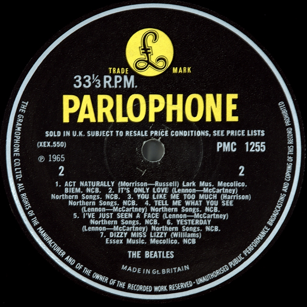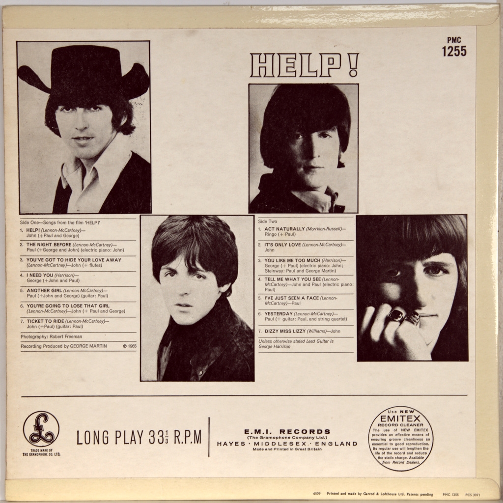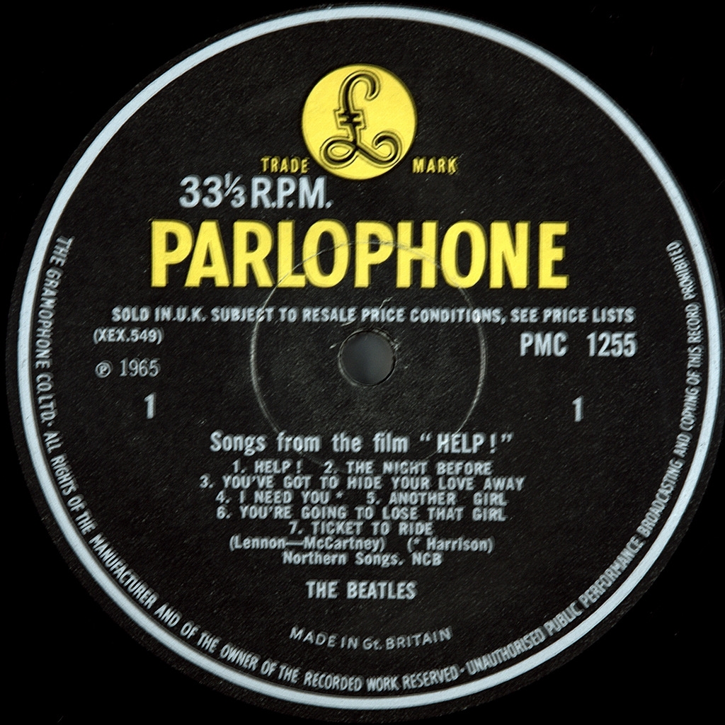 BEATLES-HELP! (MONO)-1965-ПЕРВЫЙ ПРЕСС UK-PARLOPHONE - PMC1255.Матричные номера: Сторона 1: XEX 549-2; стороны 2: XEX 550-2. Первый пресс 6 августа, 1965. Черная этикетка с желтым логотипом и серебристым принтом. “Граммофон Со. ЛТД.” prnted в начале периметру печати и “продано в Великобритании на тему...” Калька на вкладке “Use Emitex” С или без налогового кодекса КТ на этикетке.