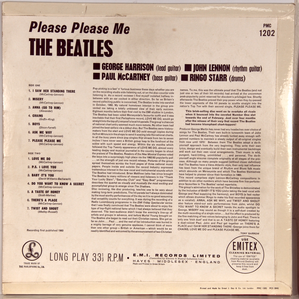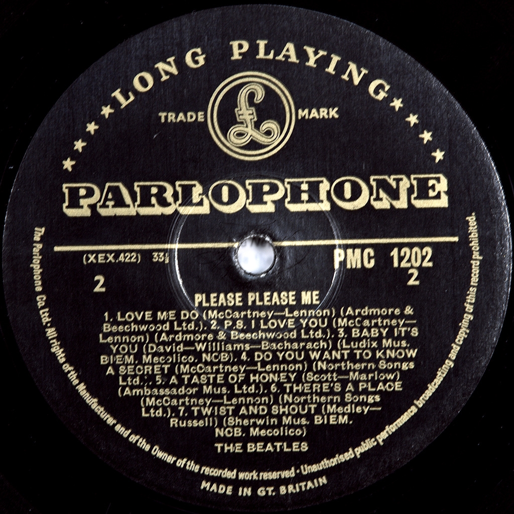 Первый пресс. 22 марта 1963 года. Первый пресс имеет черные лейблы с золотой печатью и “Parlophone Co ltd.” начало печати по периметру лейбла. “"DICK JAMES" кредиты на треки “I Saw Her Standing There”, “Misery”, “Do You Want To Know A Secret” & “There’s A Place”. С или без налогового кодекса и с 33 1/3 на этикетке. Полиэтилен внутри вкладки “USE Emitex”.