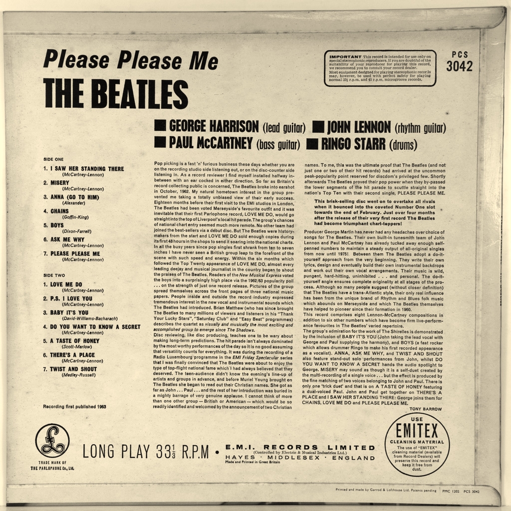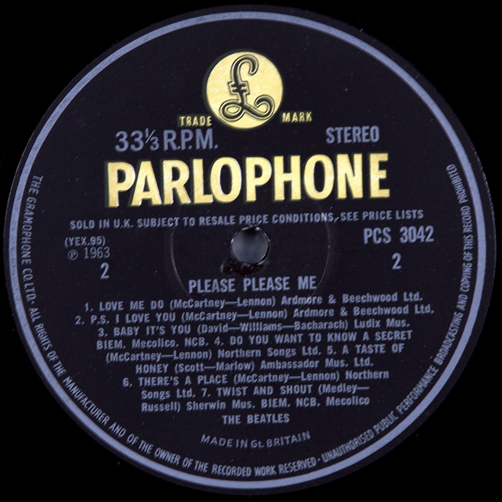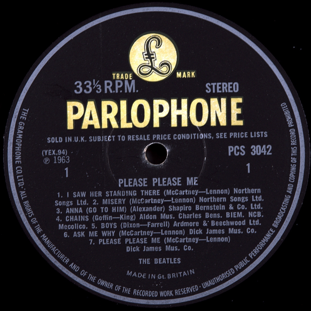 BEATLES-PLEASE PLEASE ME-1963-ШЕСТОЕ ИЗДАНИЕ 1965(СТЕРЕО) -UK-PARLOPHONE- PCS3042.Матричные номера: Сторона 1: YEX 94-1; Сторона 2: YEX 95-1. Шестой прессование, 1965 до 1969 года.Гаррод & Лофтхаус Лтд. стойка ламинированная обложка, с небольшими “стерео” на фронте. Черная этикетка с желтым логотипом и серебристым принтом. “Граммофон Со. ЛТД.” напечатано в начале периметру печати и “продается в Великобритании...” текст. Калька-на подкладке “использовать Emitex” ,С или без Налогового кодекса КТ на этикетке.