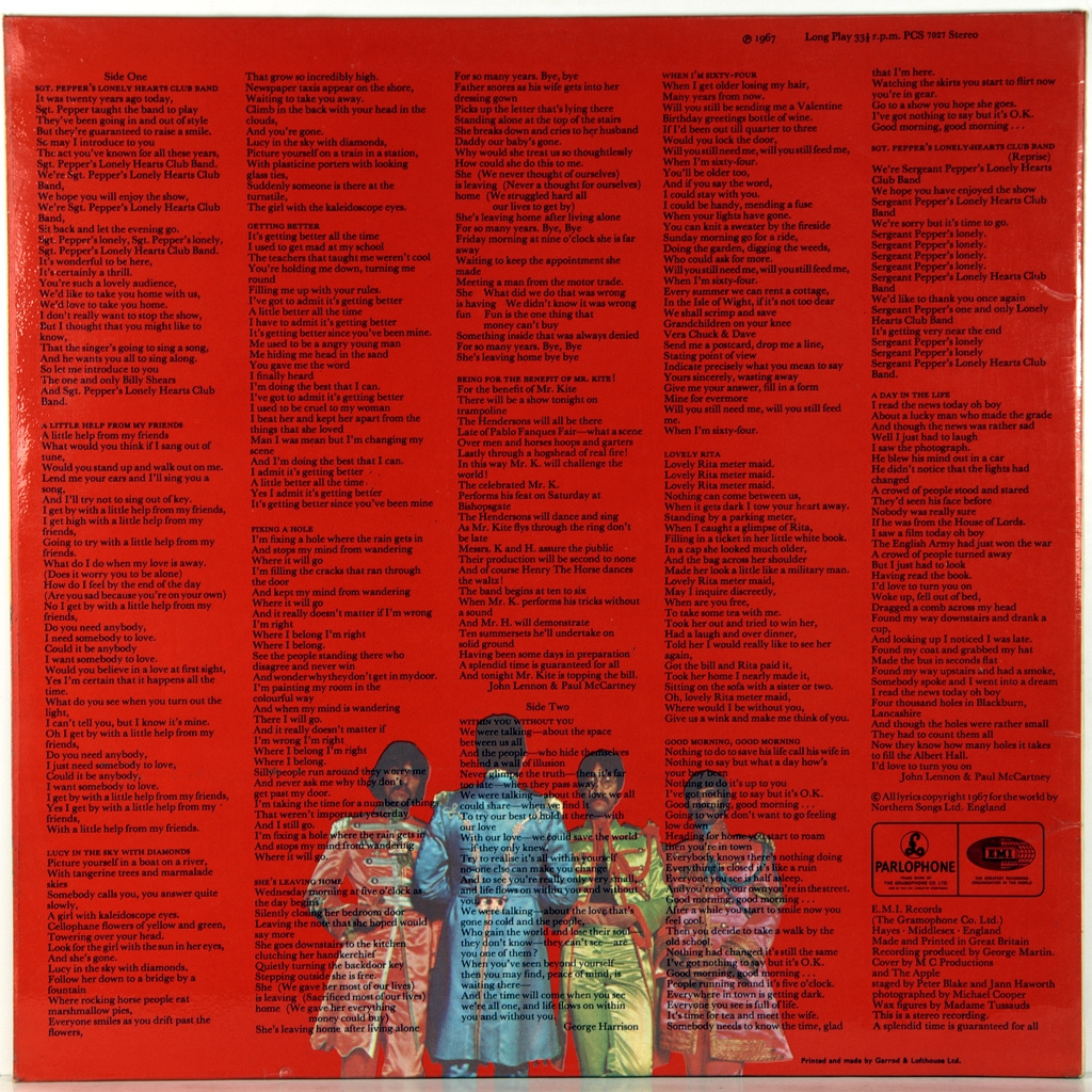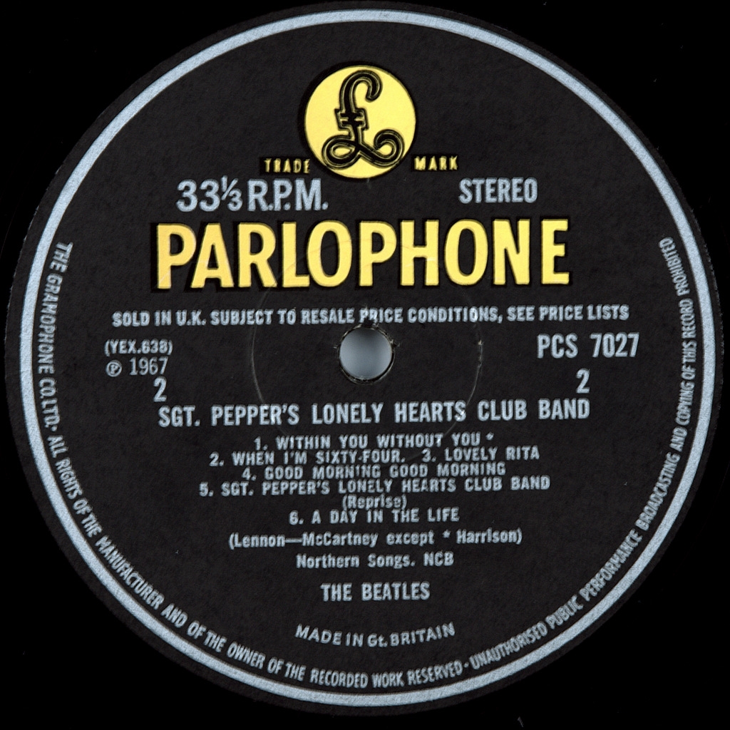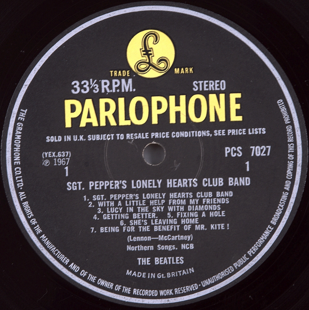 BEATLES-SGT PEPPER'S LONELY HEARTS CLUB BAND-1967-ПЕРВЫЙ ПРЕСС(СТЕРЕО) UK-PARLOPHONE- PSC7027 Матричные номера: Сторона 1: YEX 637-1; Сторона 2: YEX 638-1. стемпера 2RL/1GG (Мечта!) First pressing. June 01,1967. Black label with yellow logo and silver print. “The Gramophone Co. Ltd.” printed at the start perimeter print and “Sold in U.K. subject…” text. With or without KT tax code on the label. Matrix numbers: Side 1: YEX 637-1; Side 2: YEX 638-1.