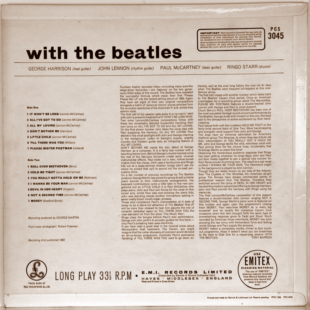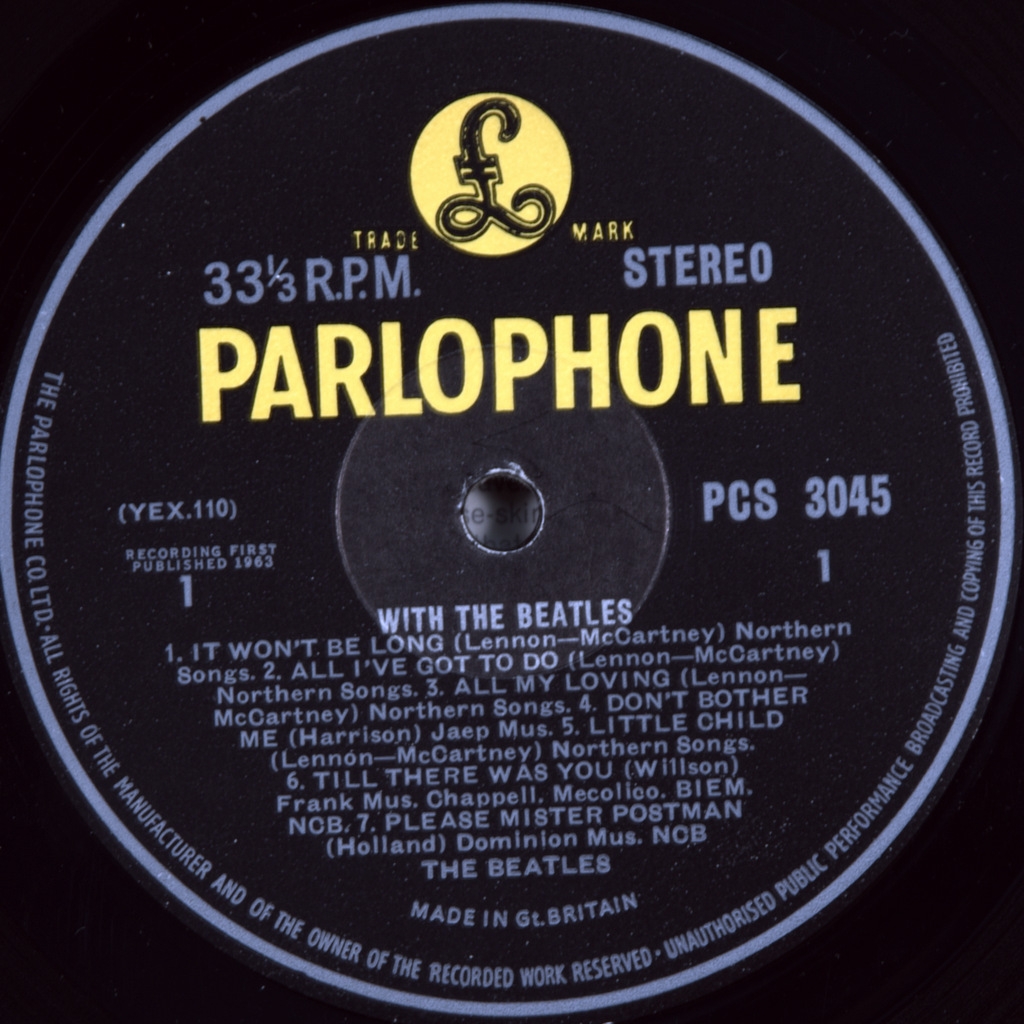 BEATLES-WITH THE BEATLES (STEREO)-1963-ПЕРВЫЙ ПРЕСС UK-PARLOPHONE - PCS3045.Матричные номера: Сторона 1: YEX 110-2; Сторона 2: YEX 111-2. стампера -1GD/3GM Первый пресс. 22 ноября 1963 года. Черная этикетка с желтым логотипом и серебристым принтом. “The Parlophone Co. Ltd.” напечатано в начале периметру печати и "запись впервые опубликована 1963". “Jobete” кредит “Money” (Сторона 2). Первый пресс имеет misspeled “You Really Gotta Hold On Me” кредит на стороне 2. Калька на вкладке “use Emitex” С или без налогового кодекса КТ на этикетке.