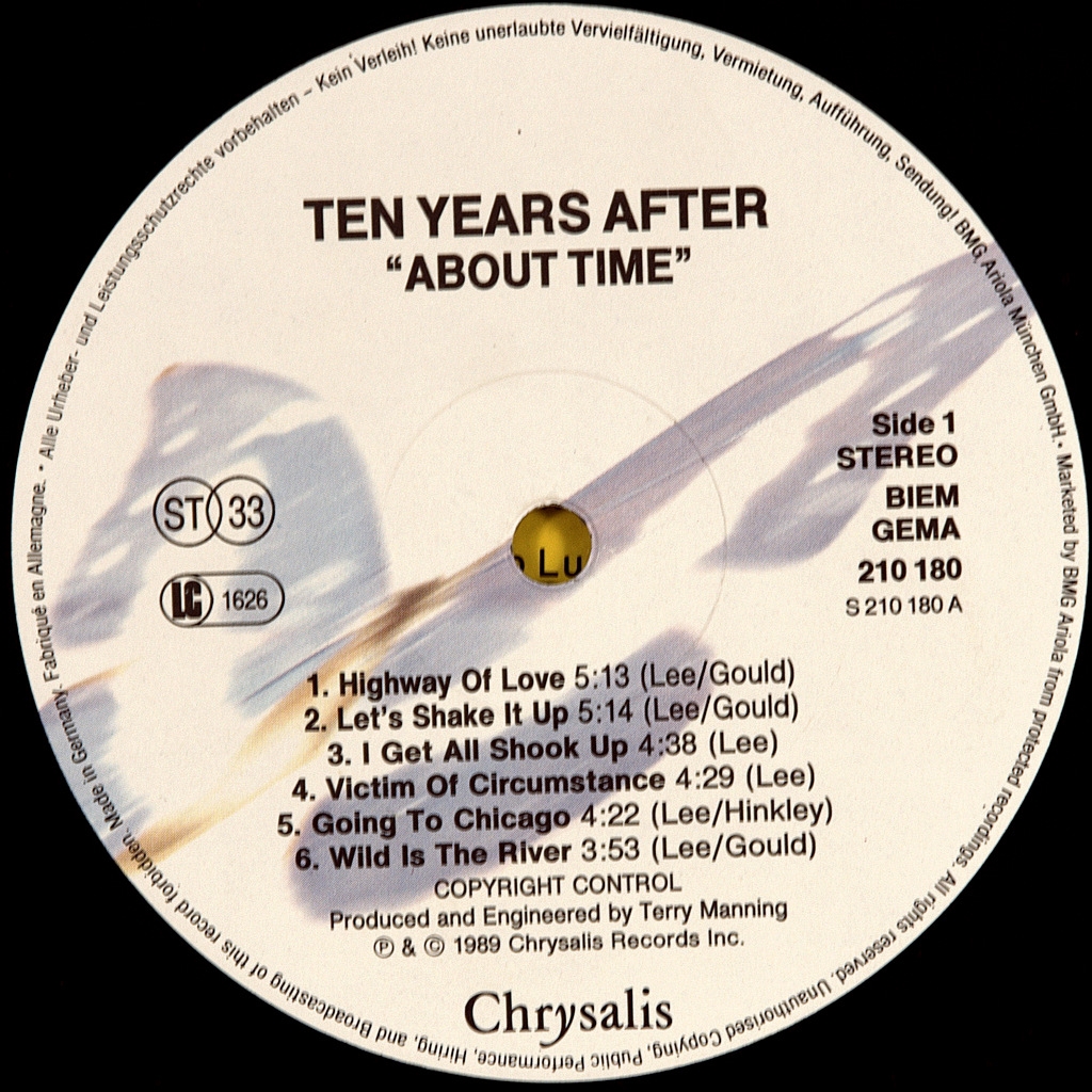 TEN YEARS AFTER-ABOUT TIME-1989-ПЕРВЫЙ ПРЕСС GERMANY-CHRYSALIS номер 210180 . Девятый студийный альбом британской блюз-роковой группы Ten Years After, выпущенный в 1989 году, на лейбле Chrysalis Records. Это первый за пятнадцать лет (со времени выхода в 1974 году релиза Positive Vibrations) и последний альбом коллектива, записанный с участием основателя, вокалиста и автора большинства его песен — Элвина Ли. Пластинка заняла 120 место в американском чарте Billboard 200.