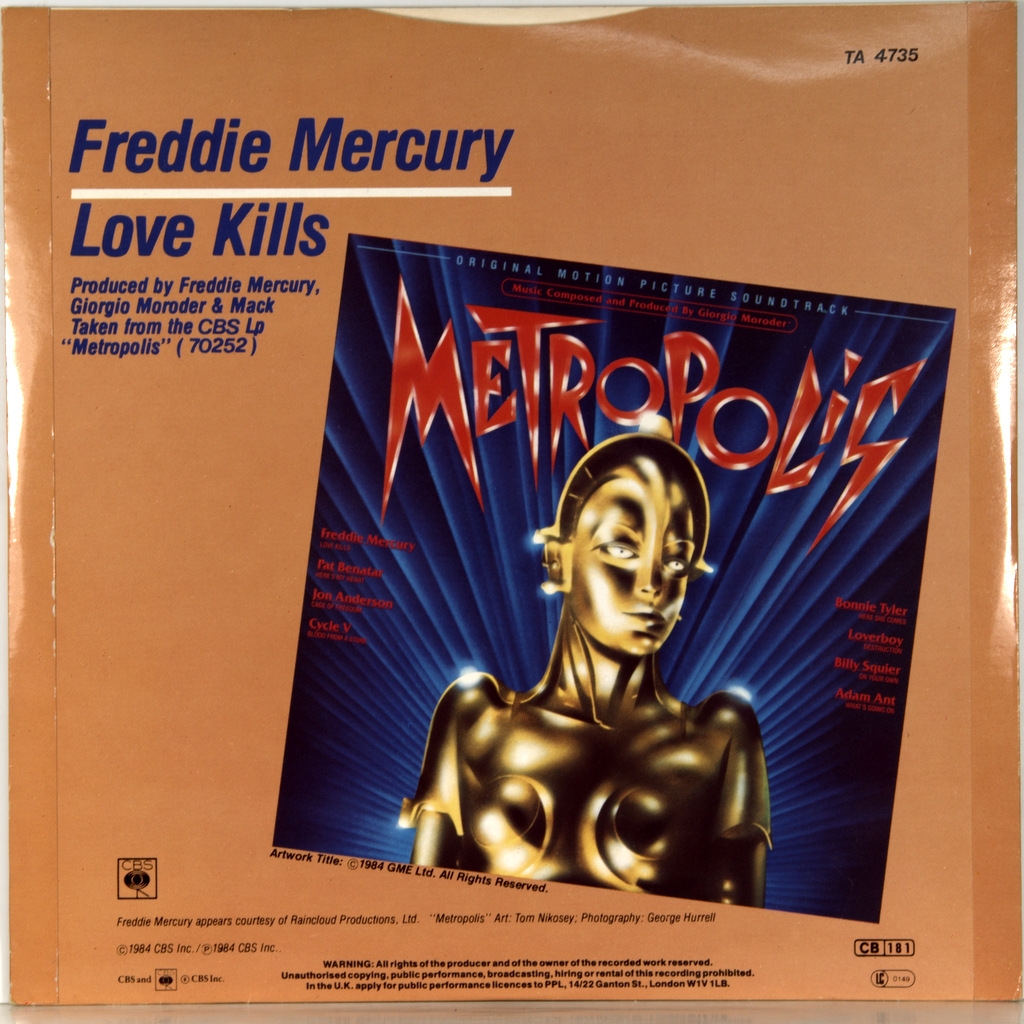 MERCURY, FREDDIE-LOVE KILLS( 12", Single, 45 RPM)-1984-ПЕРВЫЙ ПРЕСС CBS номер TA4735. Редкий британский оригинал. «Love Kills»-дебютный сольный сингл Freddie Mercury на одноимённую песню для саундтрека фильма «Metropolis», подготовленной в 1984 году Джорджо Мородером.