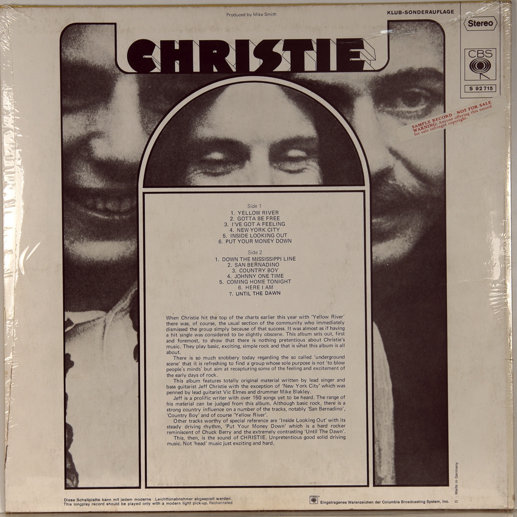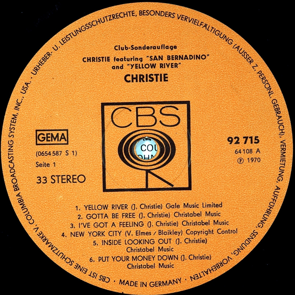 CHRISTIE-CHRISTIE-1970-ПЕРВЫЙ ПРЕСС- GERMANY-CBS номер S92715. Редкий клубный оригинал легендарной группы включающий хит YELLOW RIVER вписанный в историю рок музыки.